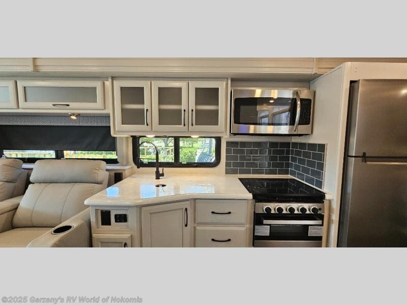 Your trips across the states aren't complete until you travel in this luxury coach! Once you arrive at your destination, the swivel captain's seats can become a part of the living area, plus there is a driver/passenger pedestal table here for your drink. Your guests can get comfortable on the manual theater seating, the Dream Dinette, and the jackknife sofa, and the LED TV here will be perfect for movie nights. You will also find a bedroom LED TV, plus an exterior LED TV to ensure you'll never go bored. The fully-equipped kitchen includes a three burner cooktop, an over-the-range stainless steel microwave, plus a residential refrigerator and pantry for food storage. Head to the rear private bedroom at the end of the day for a great night's rest on the Serenity Series king bed. There is also a dresser and a wardrobe here to keep your clothes tidy!