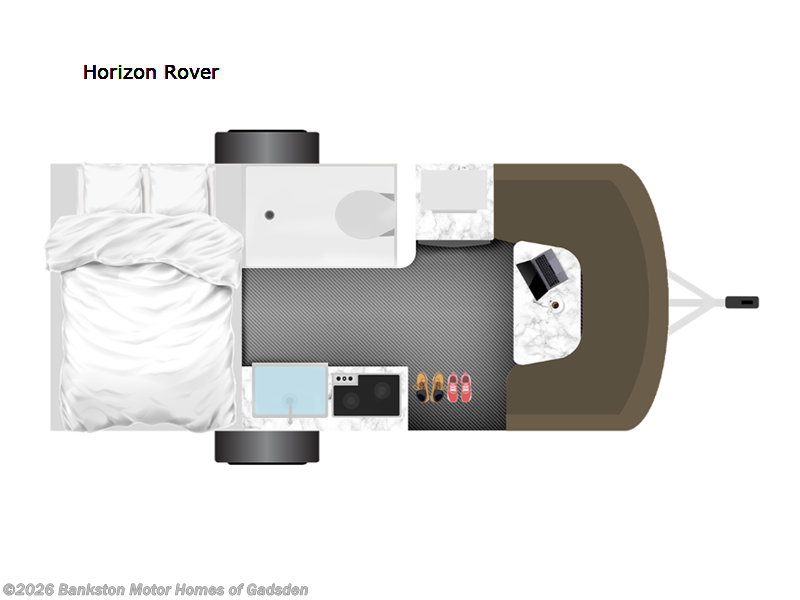 You will love the added space in this Horizon Rover travel trailer that can sleep four people each night. There is a queen-size bed in the back, plus a convertible U-shaped dinette up front for the kids or your camping friends. The kitchen includes a two burner stainless steel cooktop, a stainless steel microwave, and a 4.5 12V compressor refrigerator for your perishables. You can also add the optional 10' power awning outside for shade as you visit with loved ones! This model has a dry weight that ranges from 3,230-3,372 lbs., a tongue weight between 465-495, and a carrying capacity between 525-610 lbs.