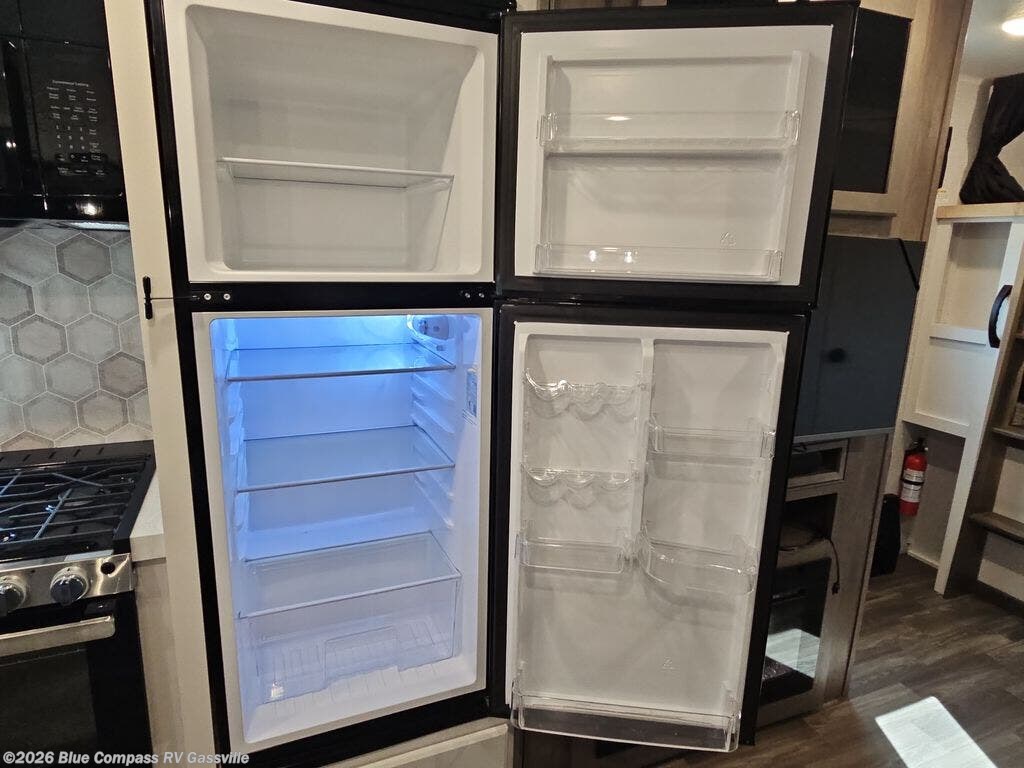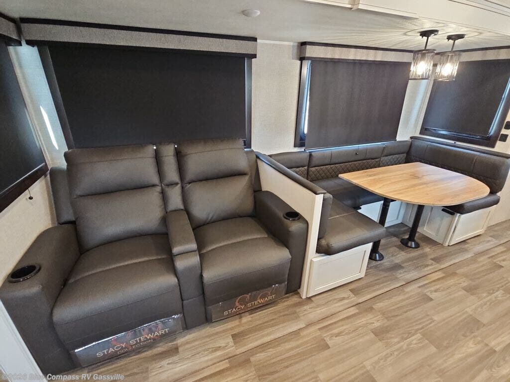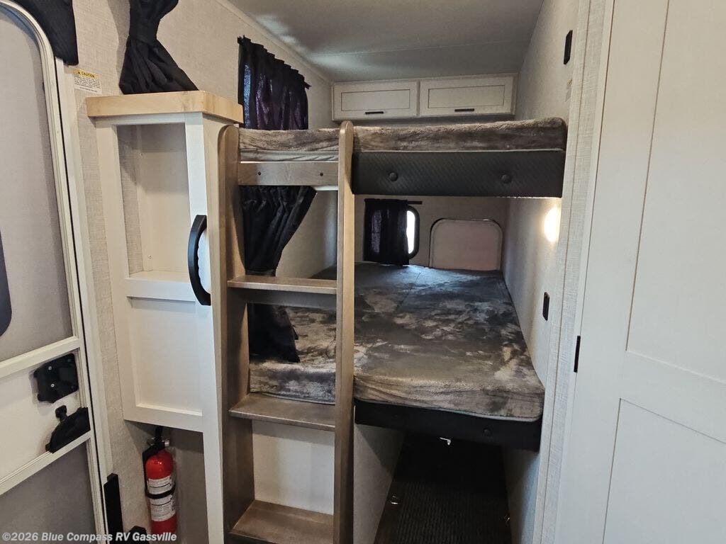 There's a lot to love about this travel trailer from the set of 48" x 80" bunk beds with storage in the steps to the walk-in pantry behind the swing-out entertainment center with a fireplace for a cozy evening indoors. Everyone can freshen up in the rear corner bathroom with the shower, keep their towel close by with the linen closet, and have plenty of countertop space to get ready in the mornings. The tri-fold sofa and U-shaped dinette slide offer comfortable places to sit, dine, and play games, as well as transform into extra sleeping spaces. The front private bedroom has a queen bed with wardrobes on either side and another wardrobe to keep your clothes looking their best. You even have an outside kitchen to cook your meals at while watching others play a game of cornhole!