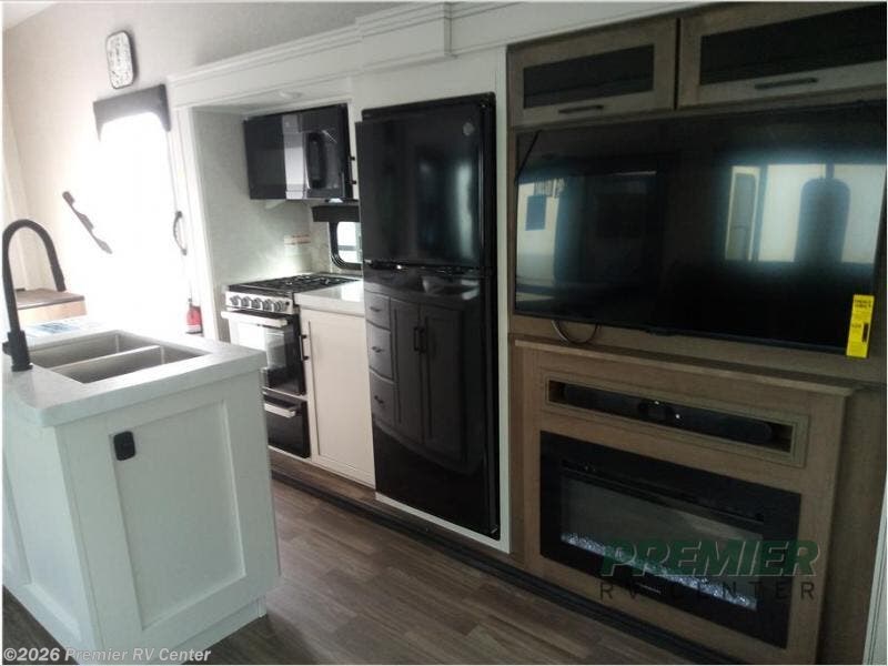 Don't pass up your chance to camp in true comfort with this fifth wheel! It features a rear living area with a tri-fold sofa for an afternoon nap and theater seating across from the entertainment center with a fireplace. The chef can choose to either prepare their meals indoors with the kitchen island and the three burner stainless steel range or at the outside kitchen with a refrigerator to enjoy a cold beverage while cooking. Hang your coats in the entry wardrobe and store your canned goods in the kitchen pantry. The dual entry bathroom has a radius shower to clean up in and is easy to access, especially those staying in the front private bedroom. The bedroom also has a wardrobe slide with a dresser and linen closet, as well as wardrobes on either side of the queen bed!
