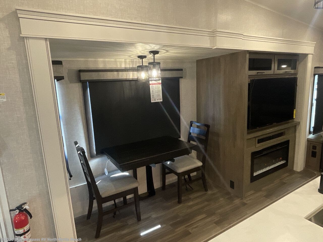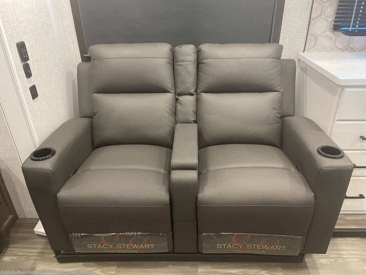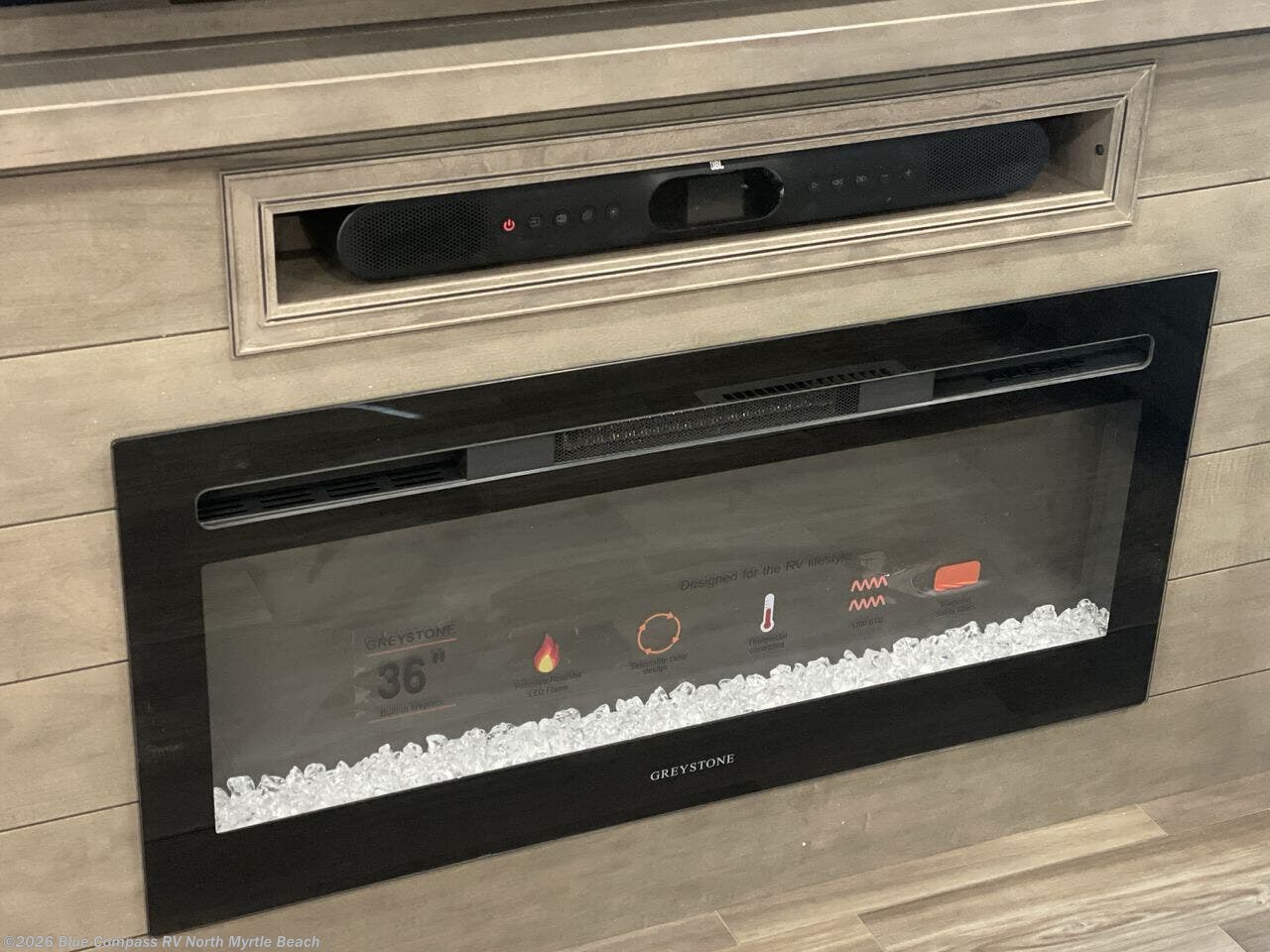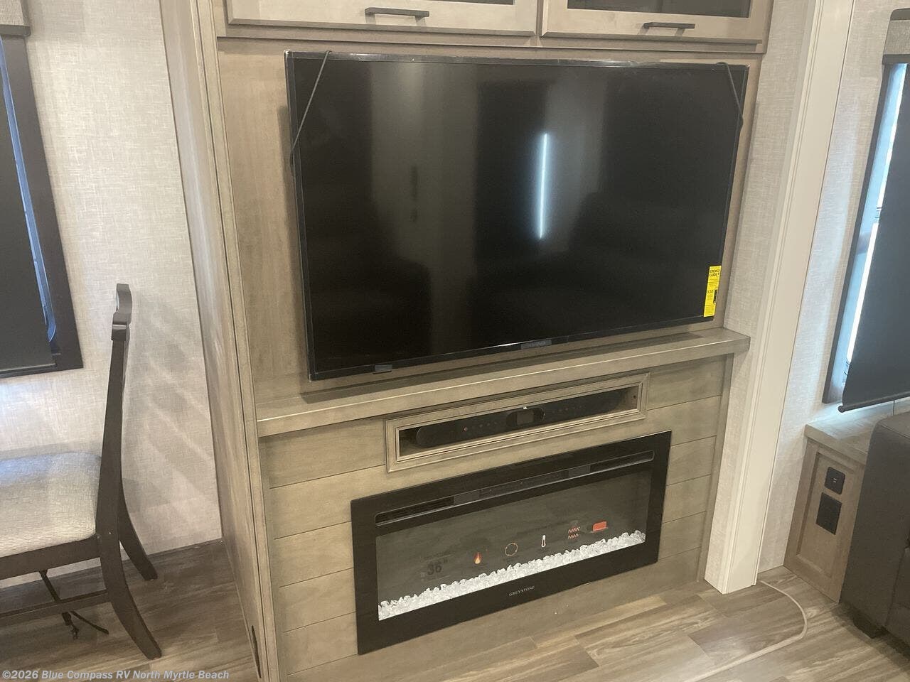Trips to the lake are made luxurious in this spacious fifth wheel for four! The rear living area includes a tri-fold sofa, a ceiling fan to keep cool, plus theater seats across from the entertainment center and fireplace. You will love the walk-in pantry and 16 cu. ft. 12V refrigerator to store food for the whole week, plus there is a convenient coat closet/pantry for even more storage. The full bath features a shower with a seat, a linen closet, plus a medicine cabinet to keep all your necessities organized. You will feel right at home in the front private bedroom with its queen bed slide out, a chest with TV prep plus a walk-in closet with shelves and washer and dryer prep. You can't go wrong with this fifth wheel!