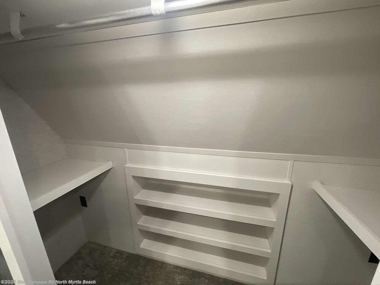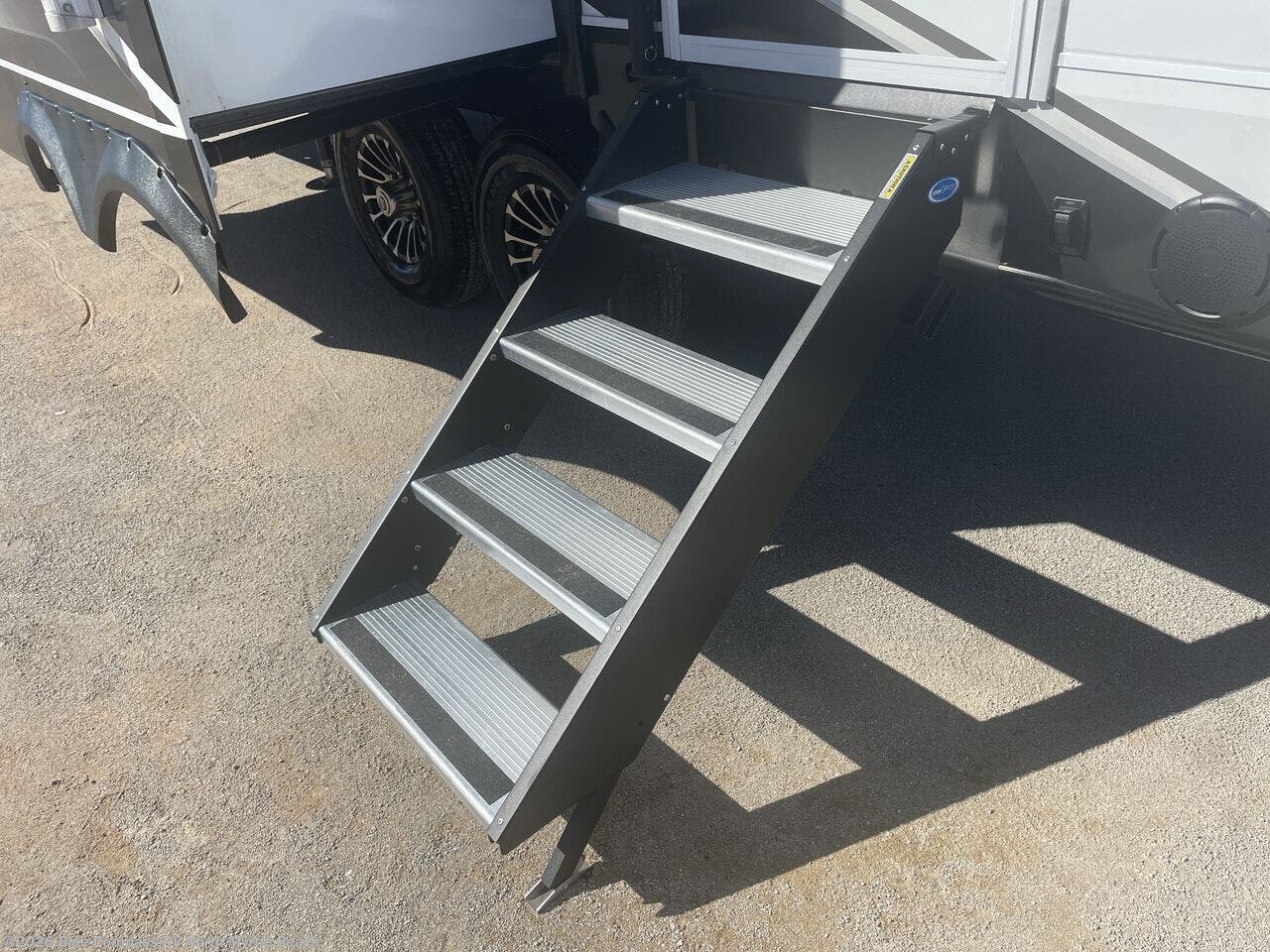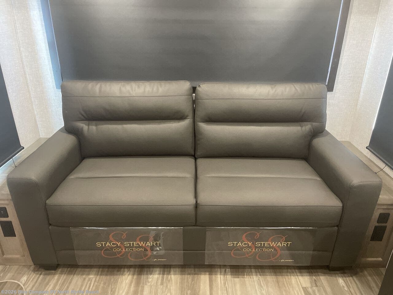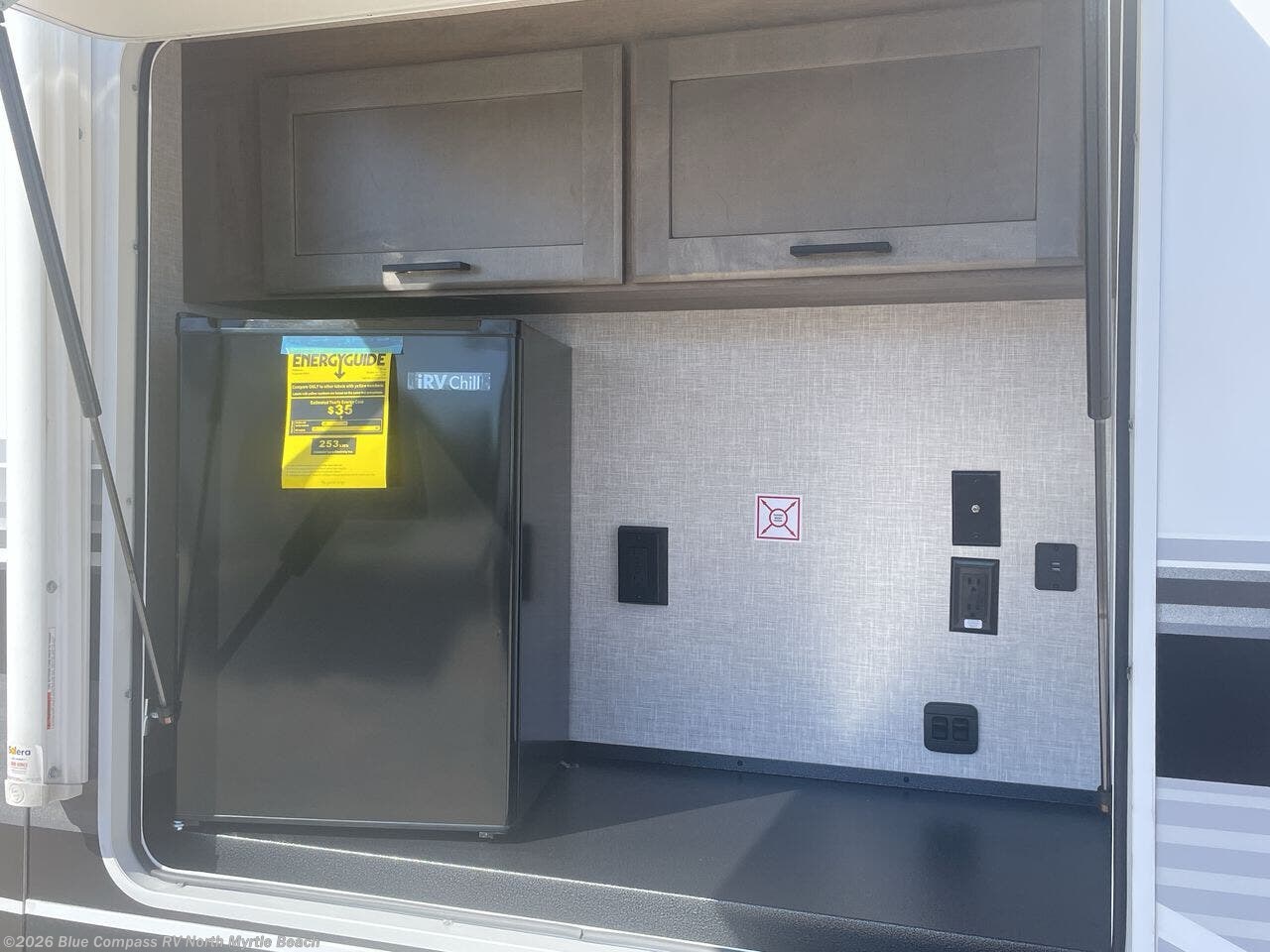 Trips to the lake are made luxurious in this spacious fifth wheel for four! The rear living area includes a tri-fold sofa, a ceiling fan to keep cool, plus theater seats across from the entertainment center and fireplace. You will love the walk-in pantry and 16 cu. ft. 12V refrigerator to store food for the whole week, plus there is a convenient coat closet/pantry for even more storage. The full bath features a shower with a seat, a linen closet, plus a medicine cabinet to keep all your necessities organized. You will feel right at home in the front private bedroom with its queen bed slide out, a chest with TV prep plus a walk-in closet with shelves and washer and dryer prep. You can't go wrong with this fifth wheel!