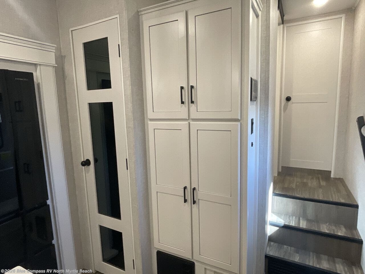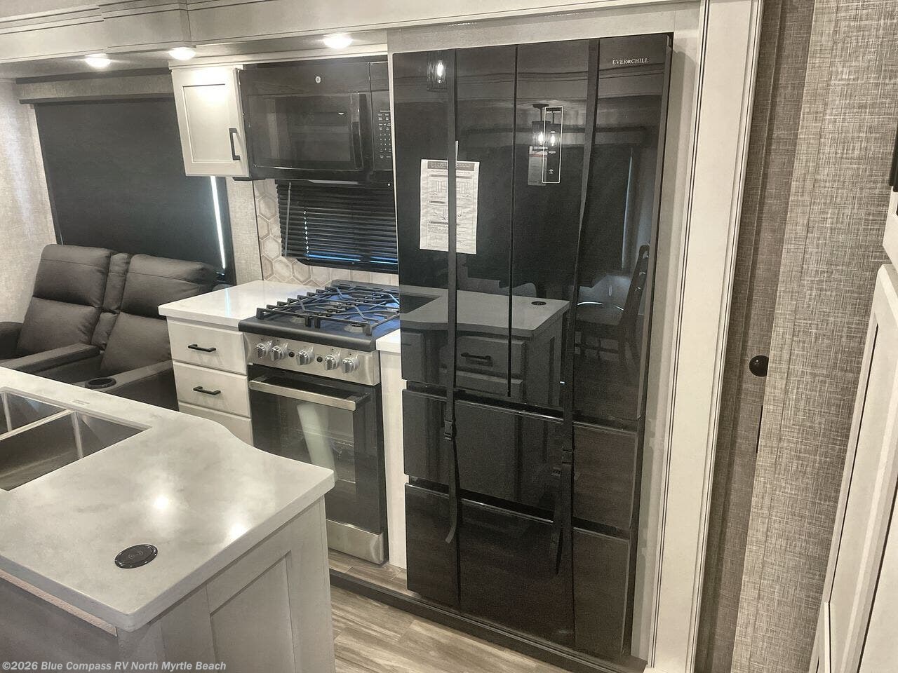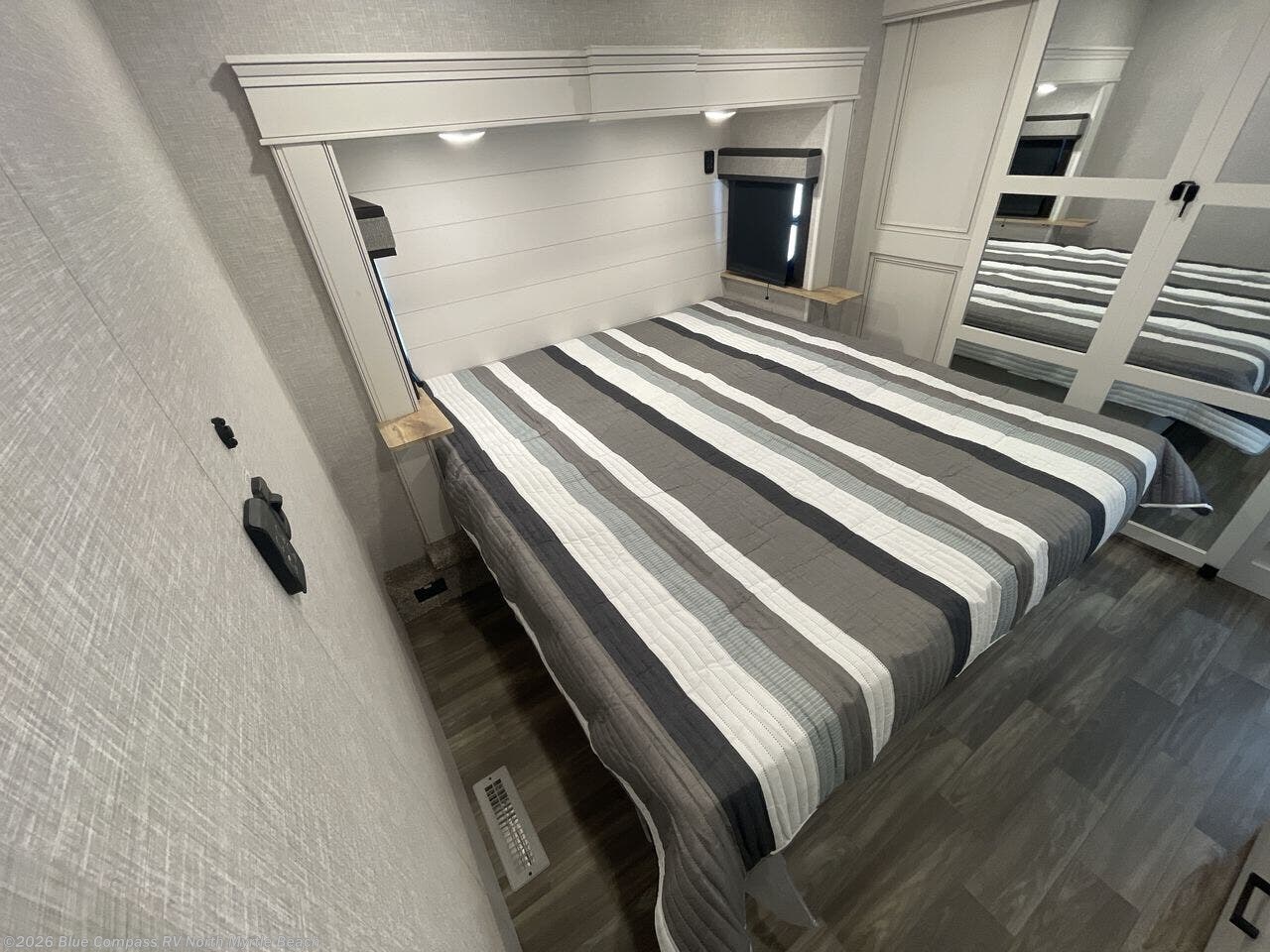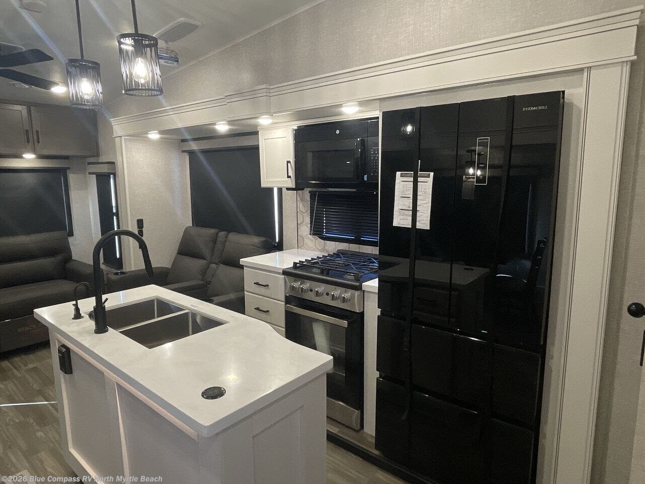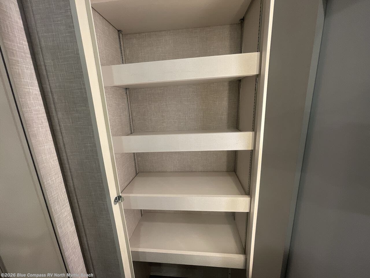 Trips to the lake are made luxurious in this spacious fifth wheel for four! The rear living area includes a tri-fold sofa, a ceiling fan to keep cool, plus theater seats across from the entertainment center and fireplace. You will love the walk-in pantry and 16 cu. ft. 12V refrigerator to store food for the whole week, plus there is a convenient coat closet/pantry for even more storage. The full bath features a shower with a seat, a linen closet, plus a medicine cabinet to keep all your necessities organized. You will feel right at home in the front private bedroom with its queen bed slide out, a chest with TV prep plus a walk-in closet with shelves and washer and dryer prep. You can't go wrong with this fifth wheel!