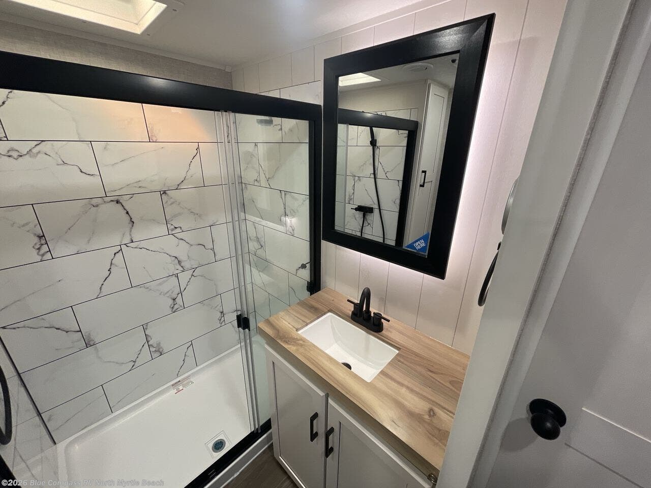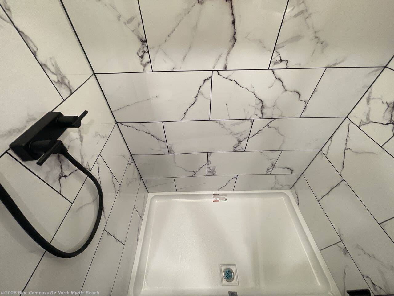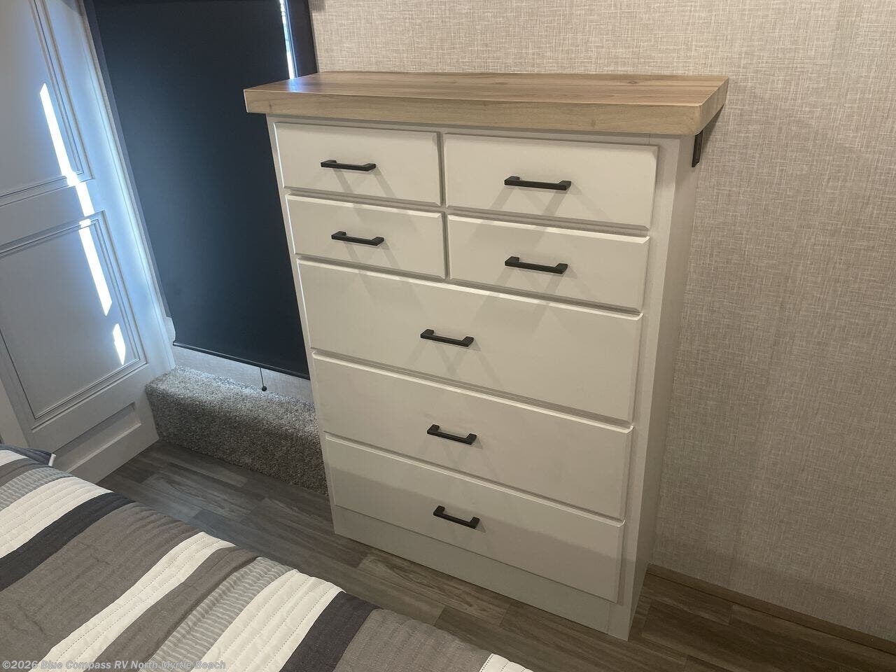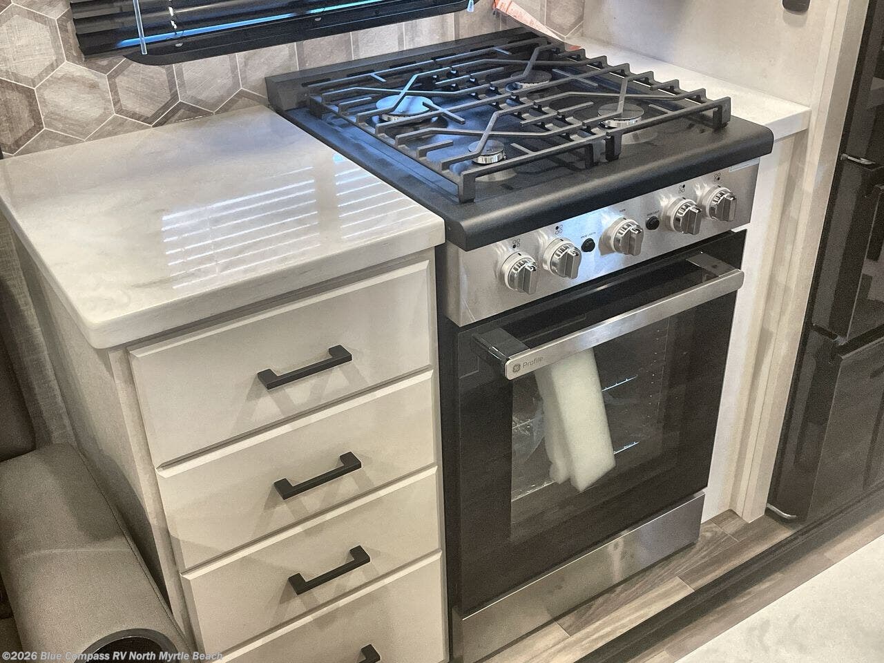 Trips to the lake are made luxurious in this spacious fifth wheel for four! The rear living area includes a tri-fold sofa, a ceiling fan to keep cool, plus theater seats across from the entertainment center and fireplace. You will love the walk-in pantry and 16 cu. ft. 12V refrigerator to store food for the whole week, plus there is a convenient coat closet/pantry for even more storage. The full bath features a shower with a seat, a linen closet, plus a medicine cabinet to keep all your necessities organized. You will feel right at home in the front private bedroom with its queen bed slide out, a chest with TV prep plus a walk-in closet with shelves and washer and dryer prep. You can't go wrong with this fifth wheel!