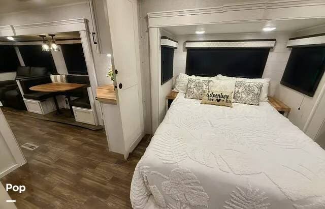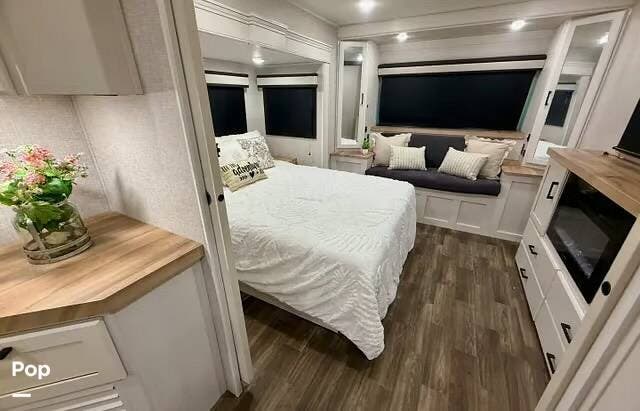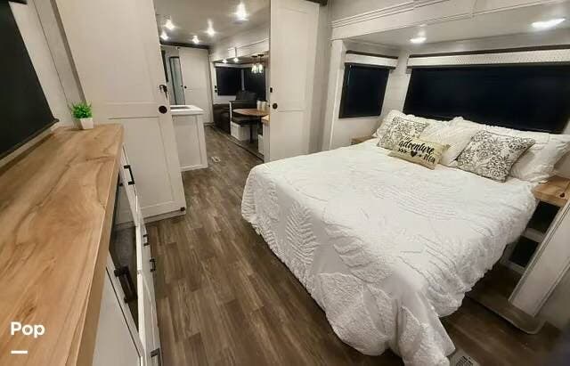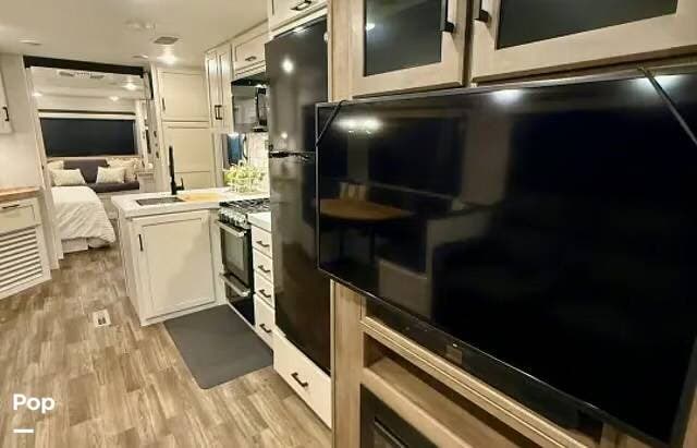 You'll appreciate the roominess made by having two slides, and the camper also features some unique items. A full pantry opens up behind the TV in the living area, as shown in photos. The pantry is huge compared to other campers this size.