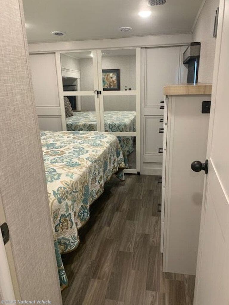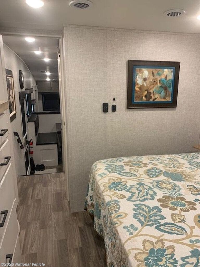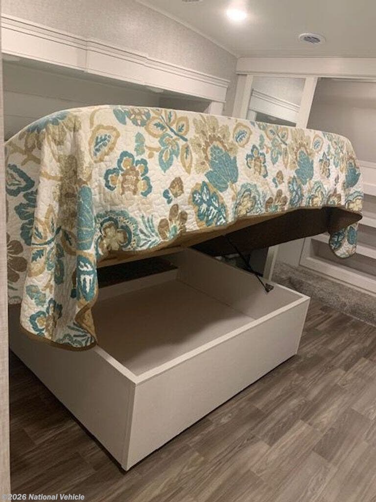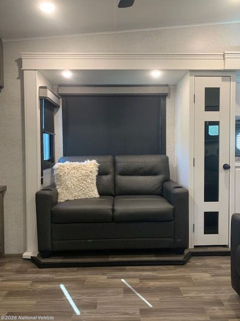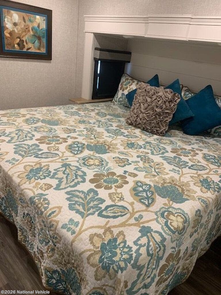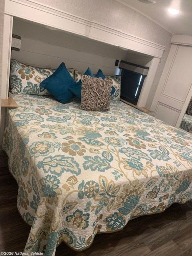 Inside, you?ll find a spacious rear-den floorplan with residential-style seating, perfect for entertaining or relaxing after a day of adventure. The living area features plush furnishings, large panoramic windows, and a warm, inviting atmosphere. The king-size bed, complete with factory bedspread, ensures restful nights, while abundant storage throughout makes extended trips effortless.