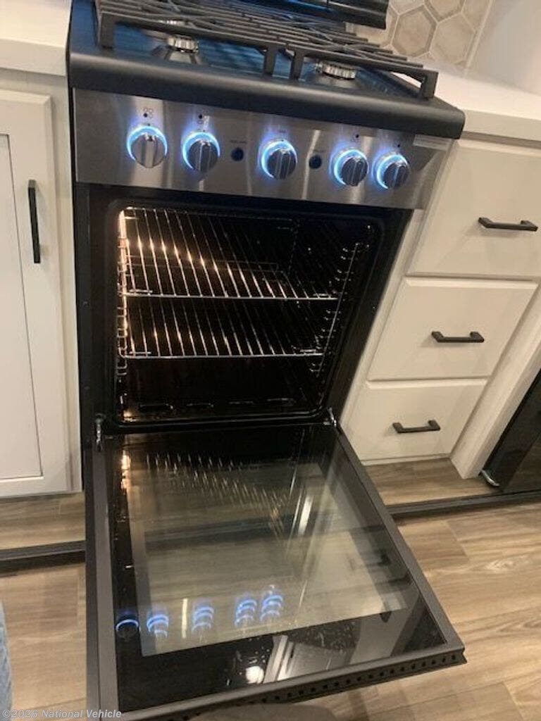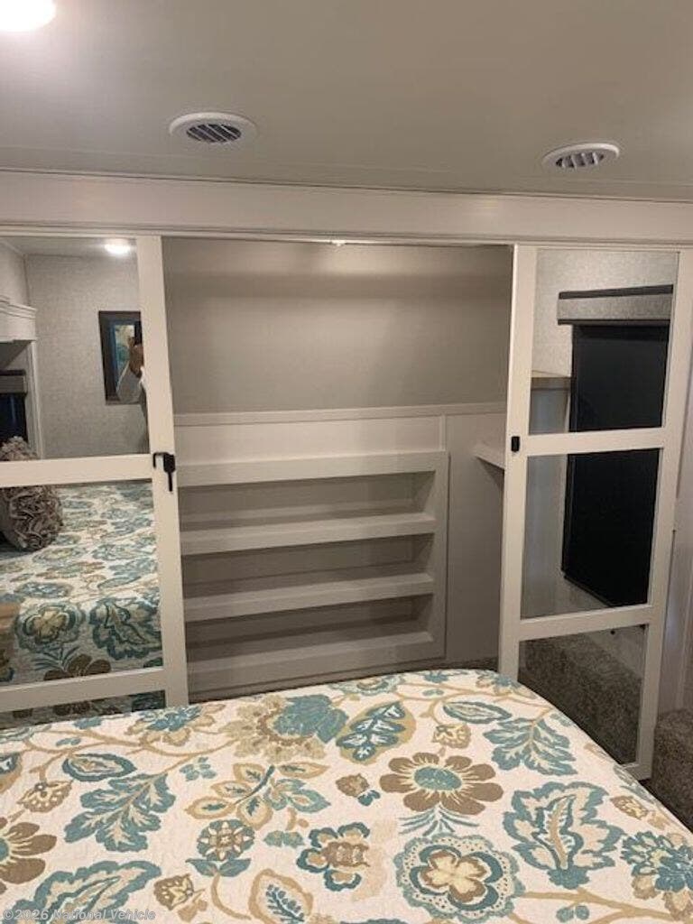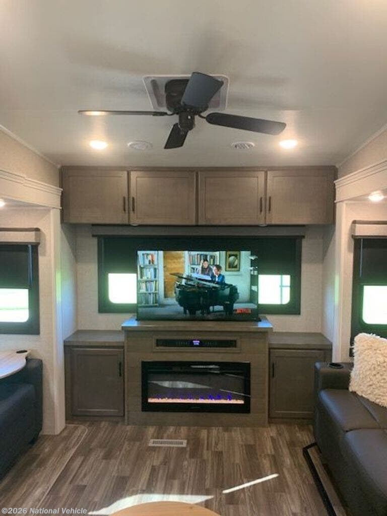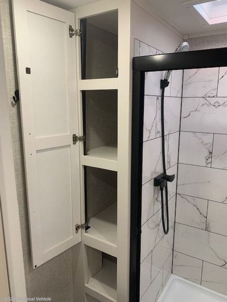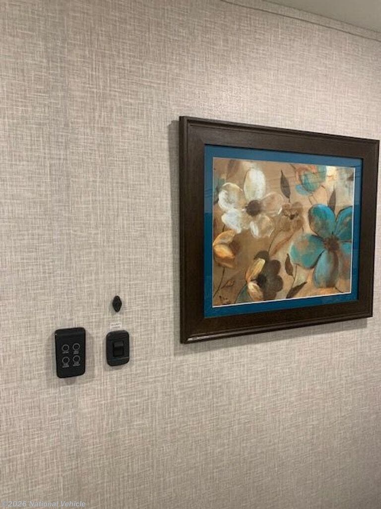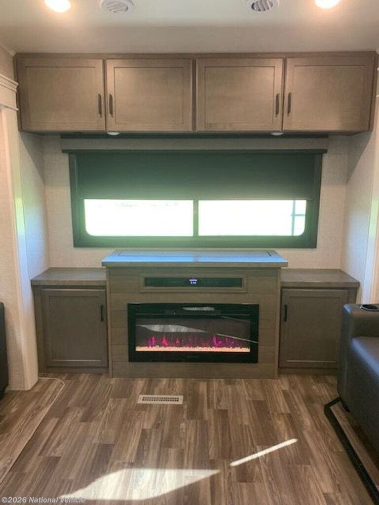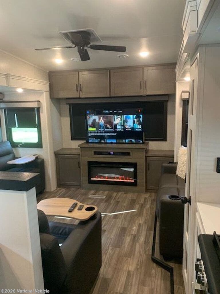 Inside, you?ll find a spacious rear-den floorplan with residential-style seating, perfect for entertaining or relaxing after a day of adventure. The living area features plush furnishings, large panoramic windows, and a warm, inviting atmosphere. The king-size bed, complete with factory bedspread, ensures restful nights, while abundant storage throughout makes extended trips effortless.
