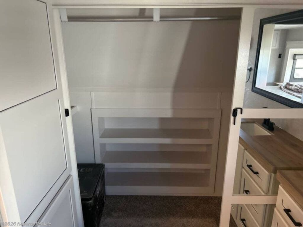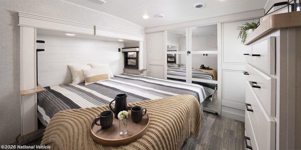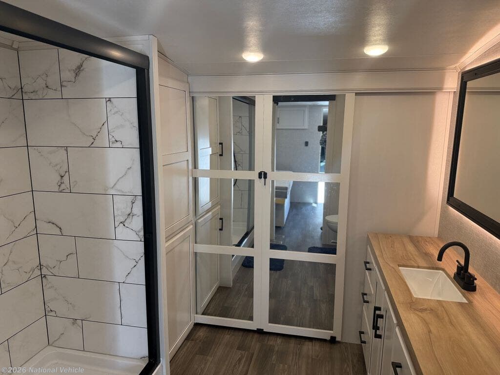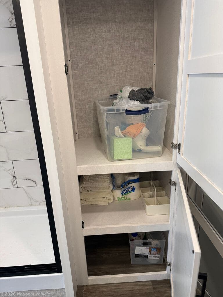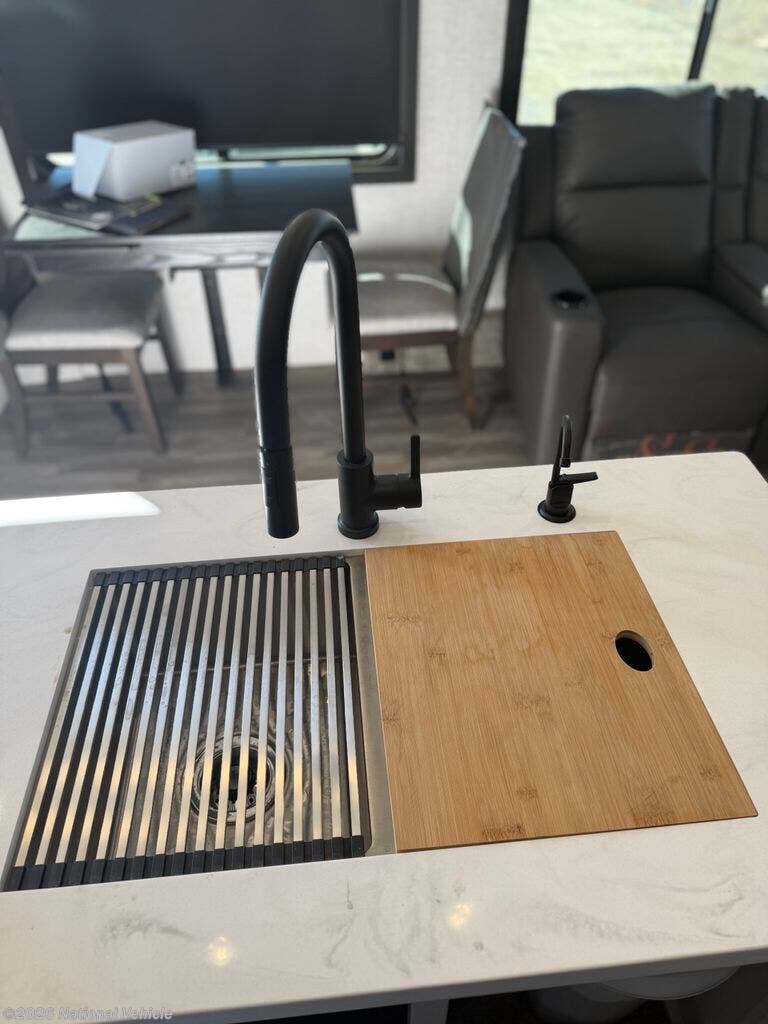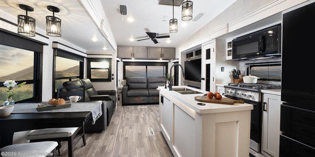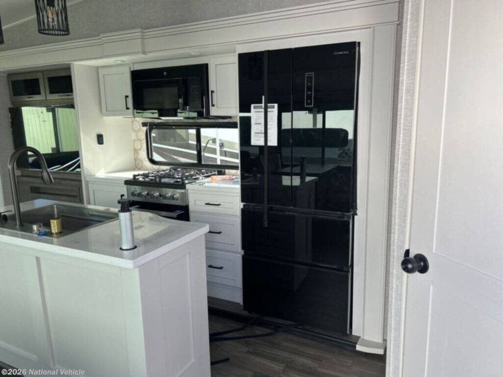 The kitchen is equally impressive, offering solid-surface countertops, a residential-style refrigerator, ample cabinetry, and generous prep space. Whether you?re preparing quick meals or hosting dinner with guests, this well-appointed kitchen supports your lifestyle on the road.