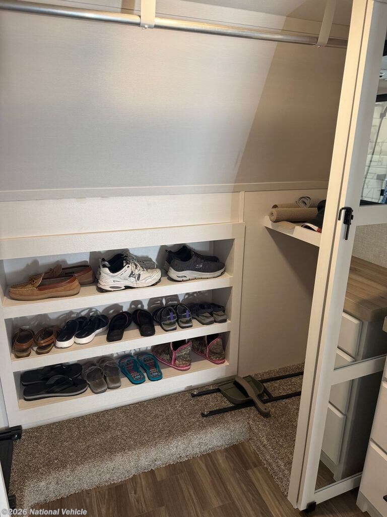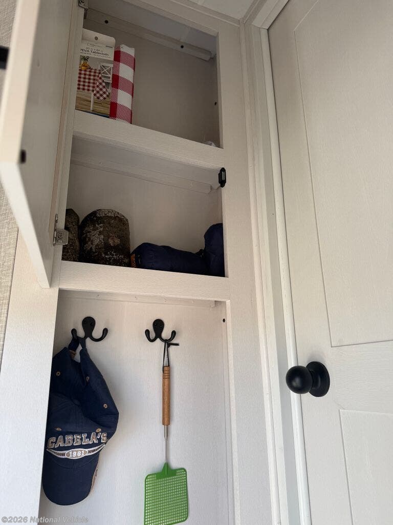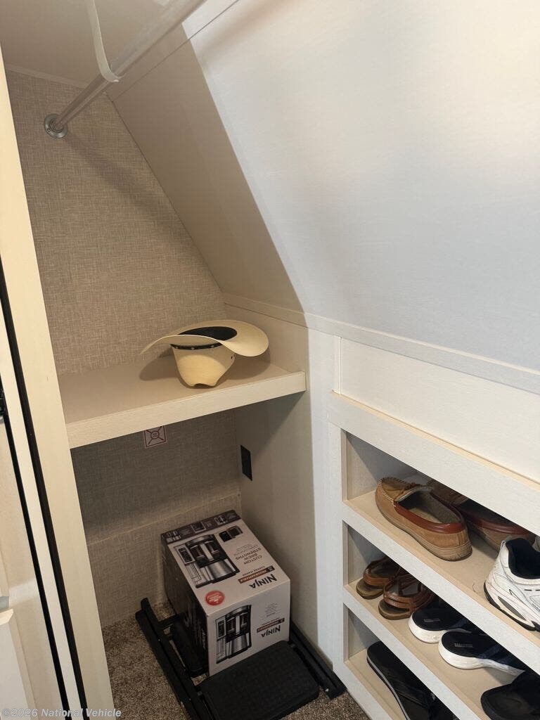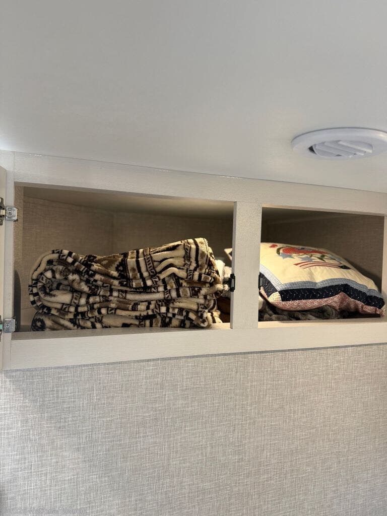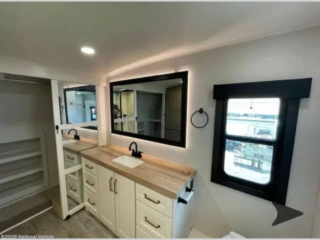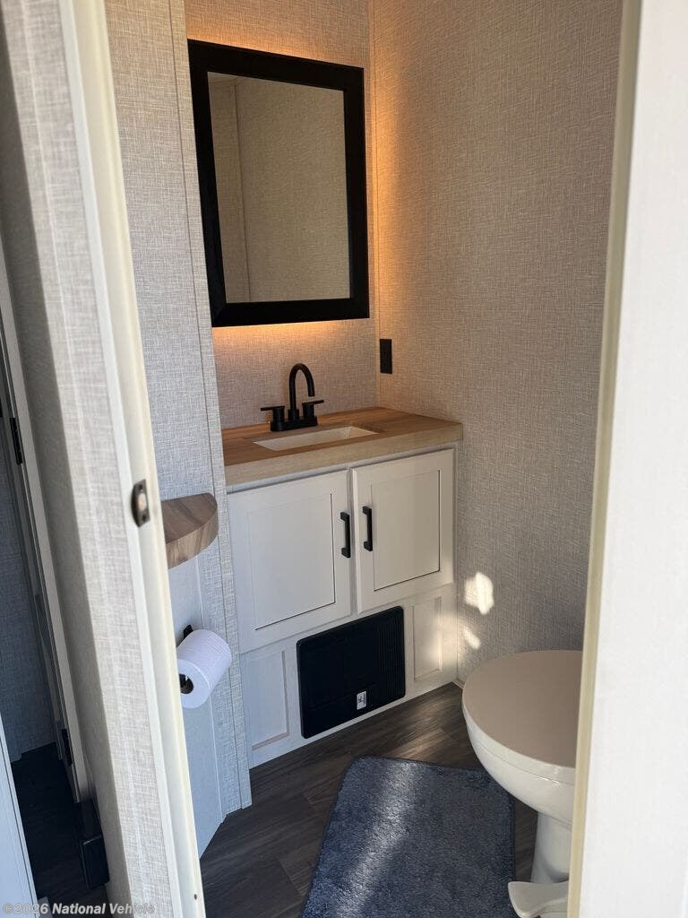 The kitchen is equally impressive, offering solid-surface countertops, a residential-style refrigerator, ample cabinetry, and generous prep space. Whether you?re preparing quick meals or hosting dinner with guests, this well-appointed kitchen supports your lifestyle on the road.