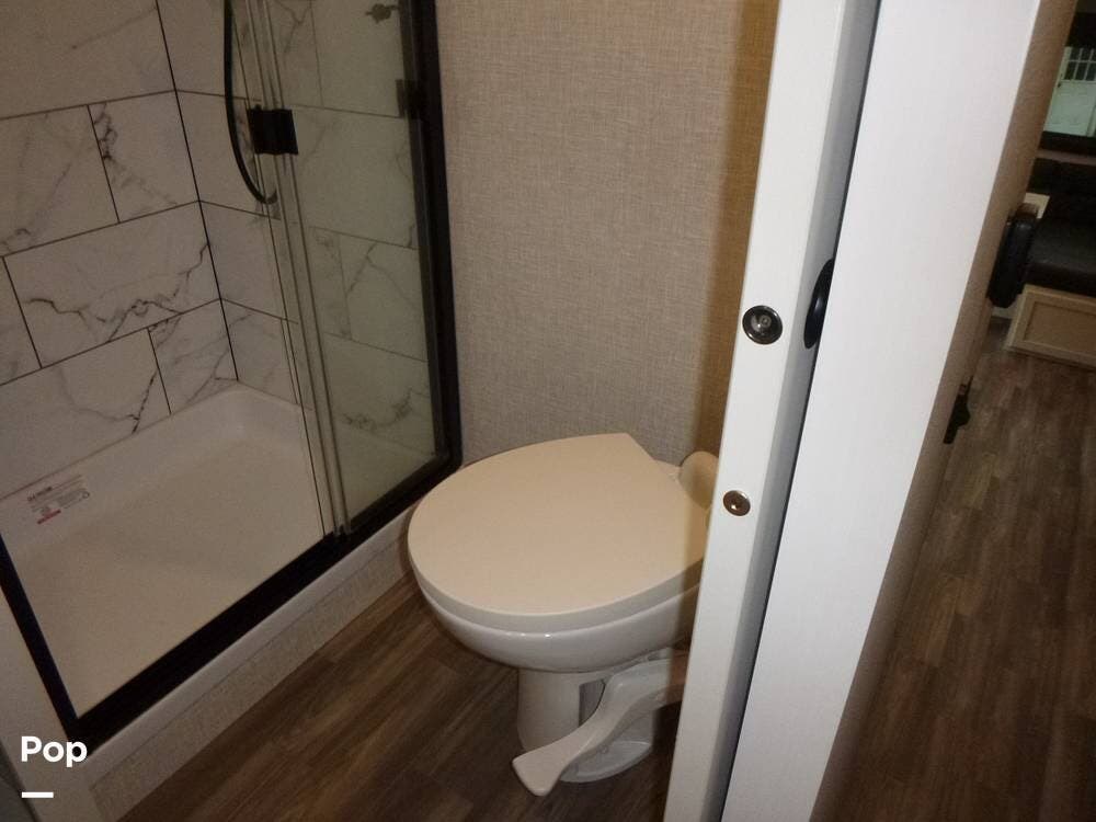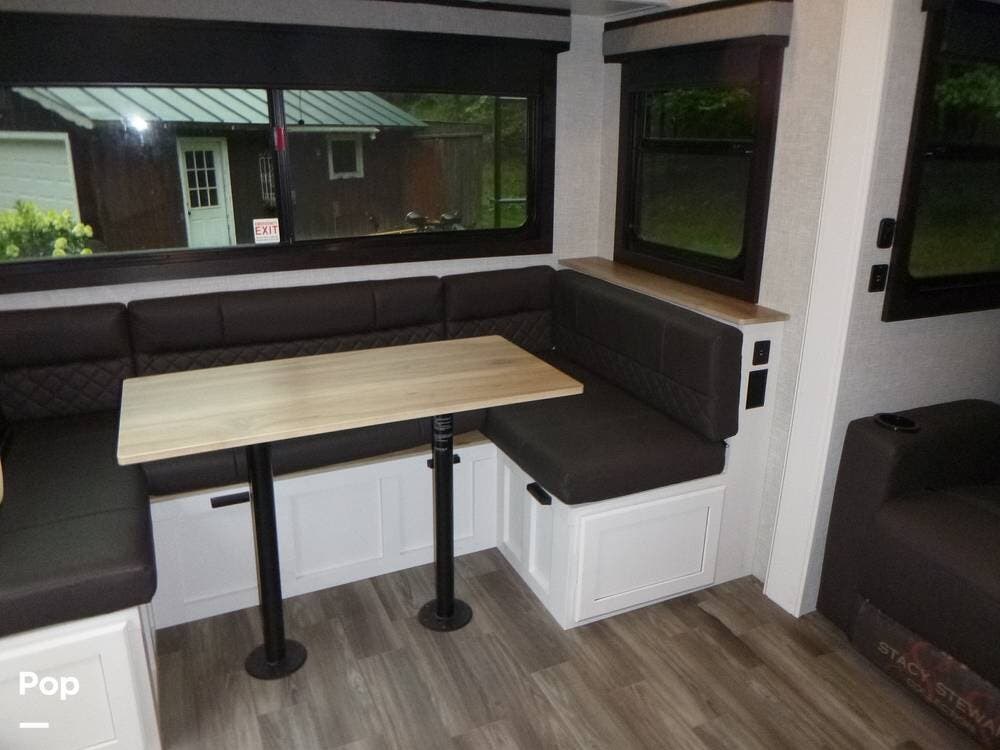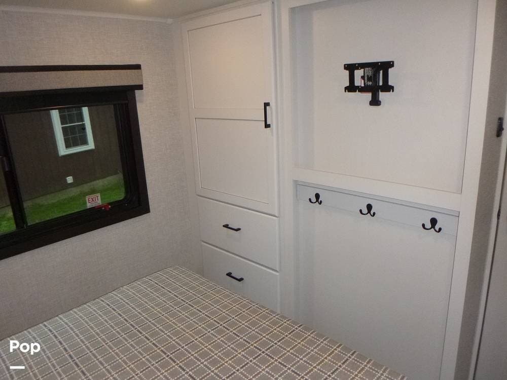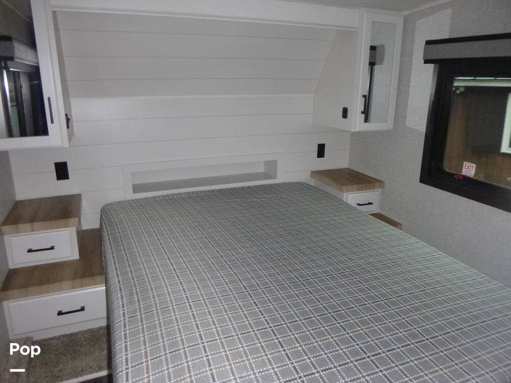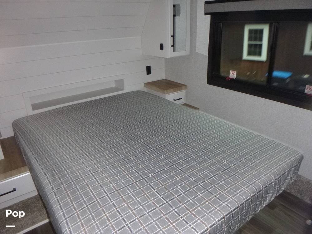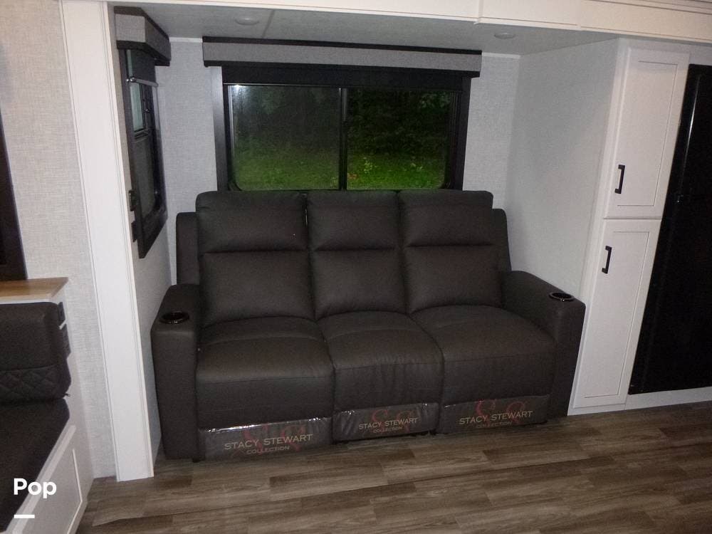 The living space is warm and inviting, featuring theater seating and a cozy dinette, perfect for family meals, game nights, or curling up with a movie after a day outdoors. At night, retreat to your private master bedroom, complete with a comfortable walk-around queen bed and ample storage for everything you bring along.