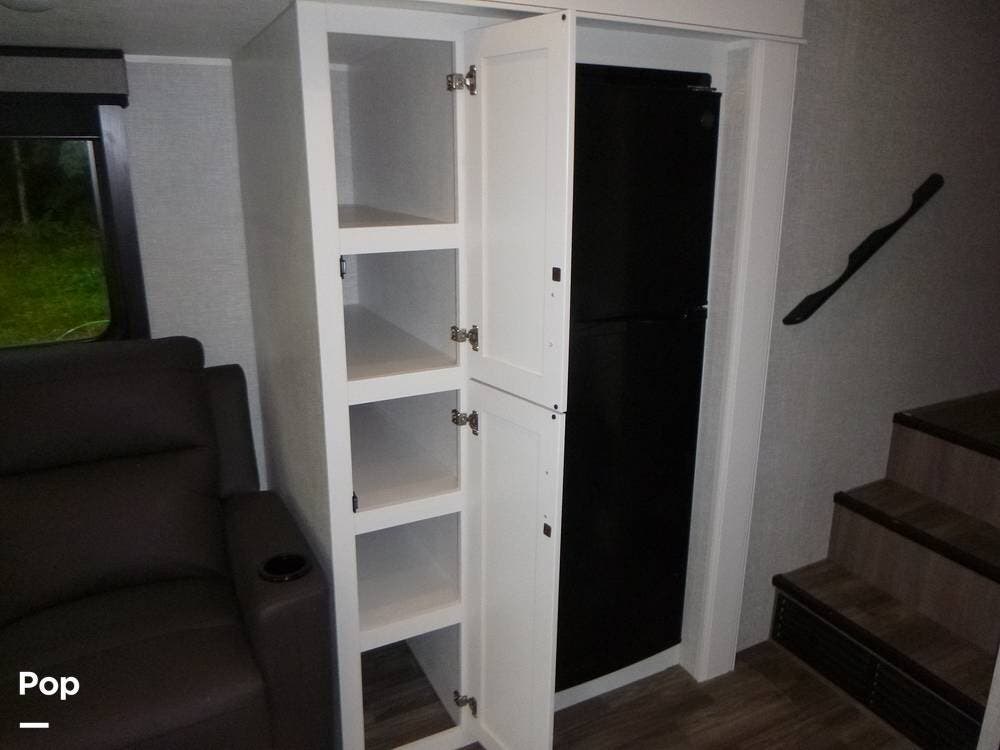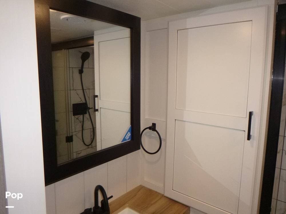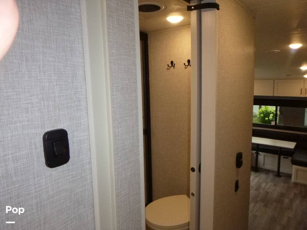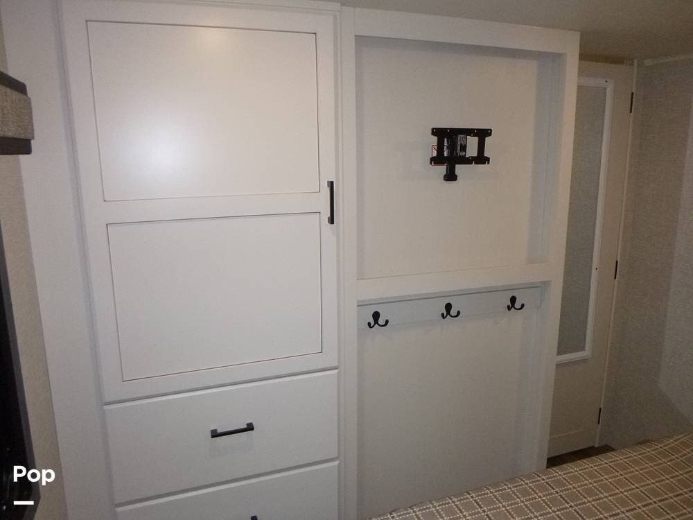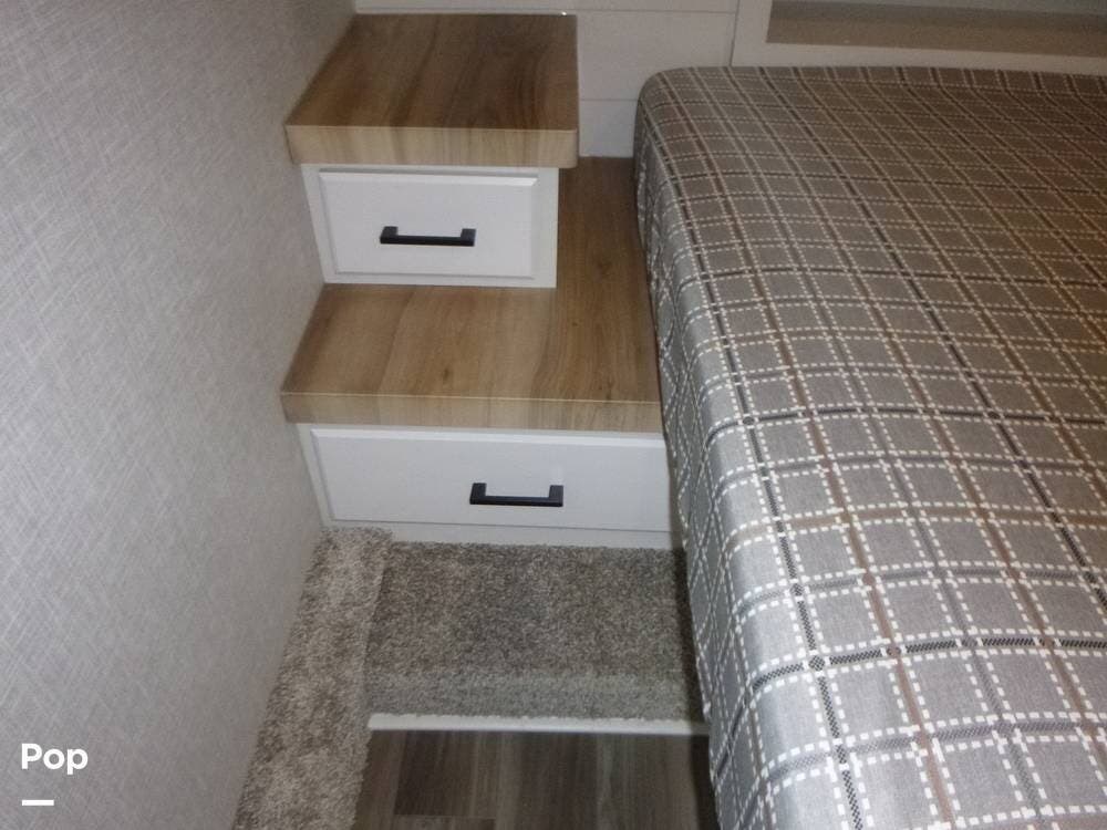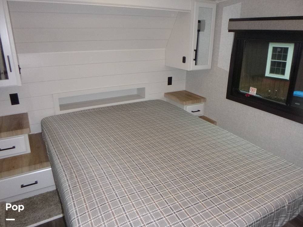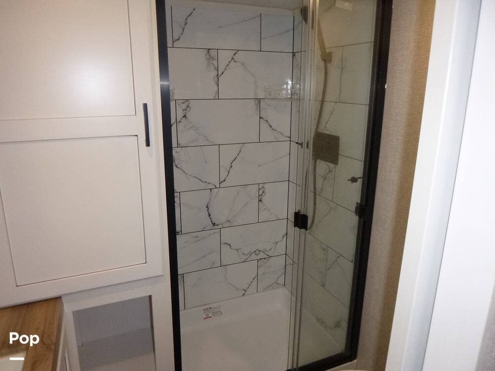 The living space is warm and inviting, featuring theater seating and a cozy dinette, perfect for family meals, game nights, or curling up with a movie after a day outdoors. At night, retreat to your private master bedroom, complete with a comfortable walk-around queen bed and ample storage for everything you bring along.