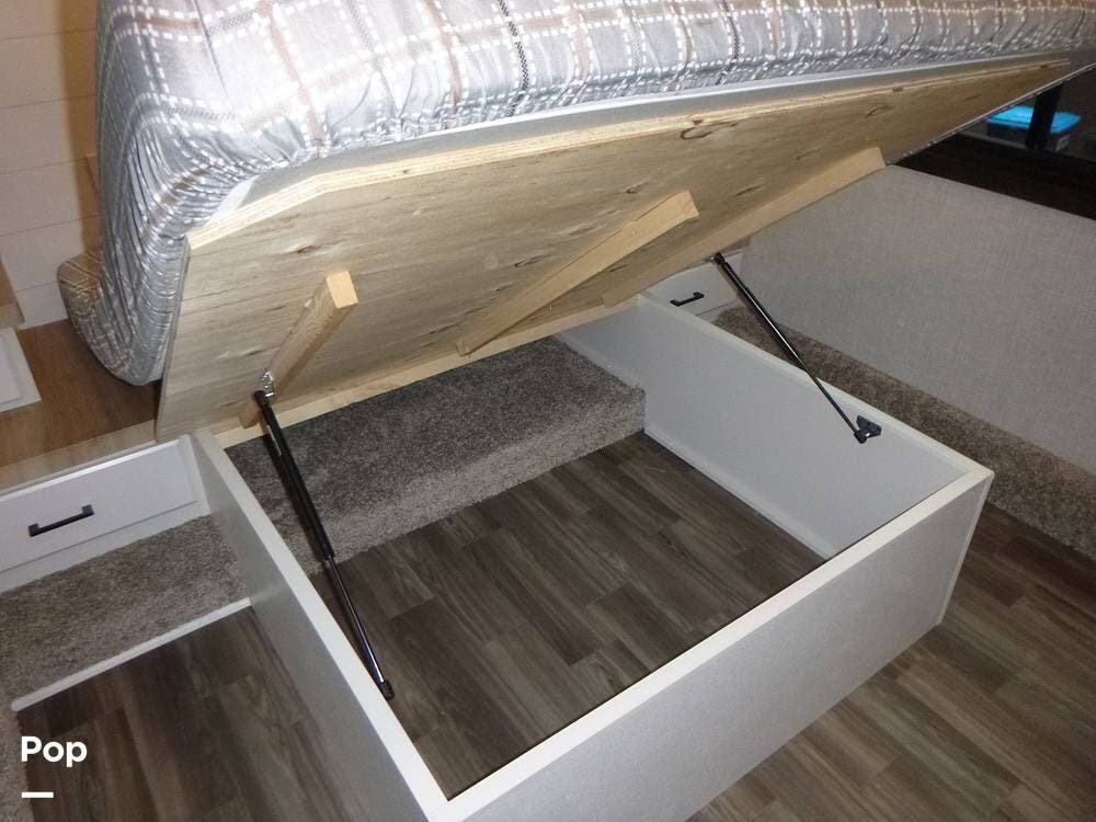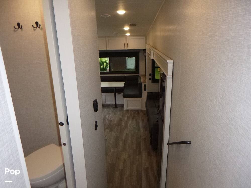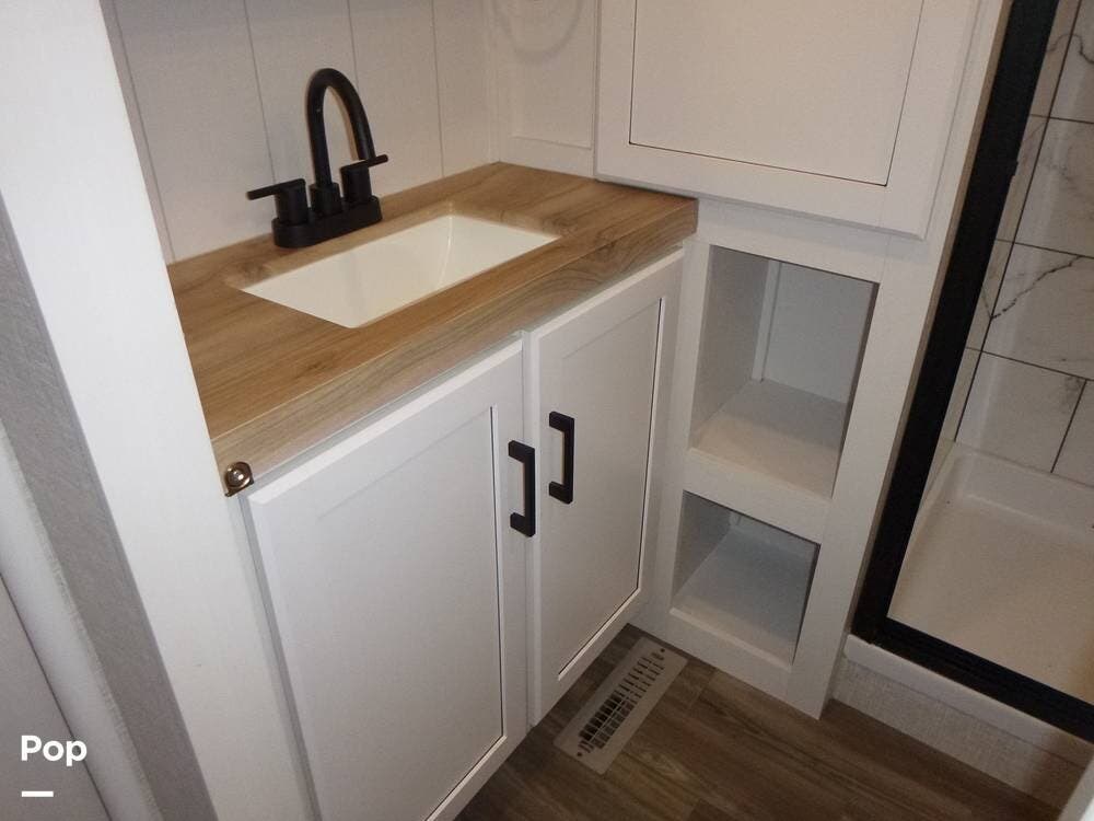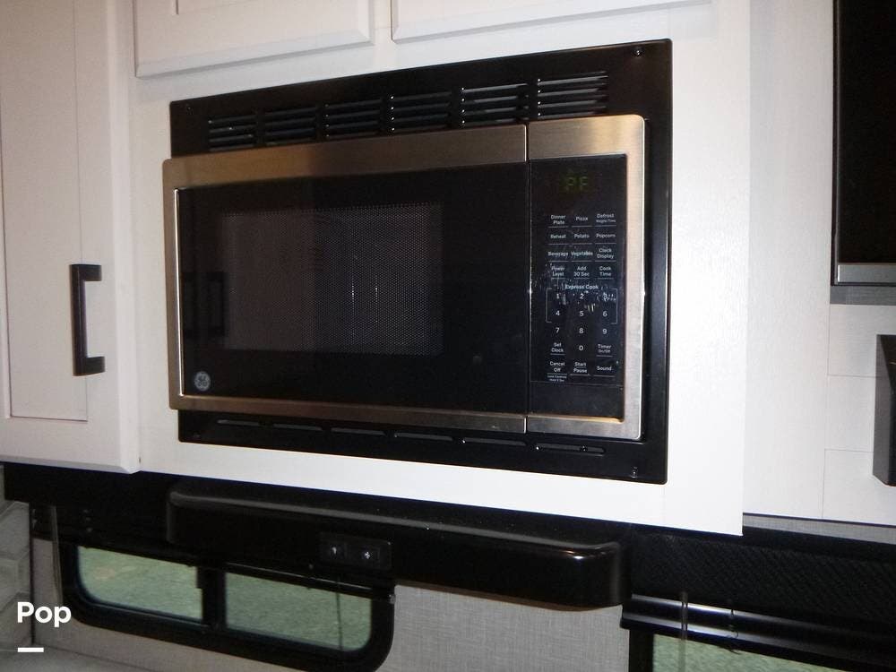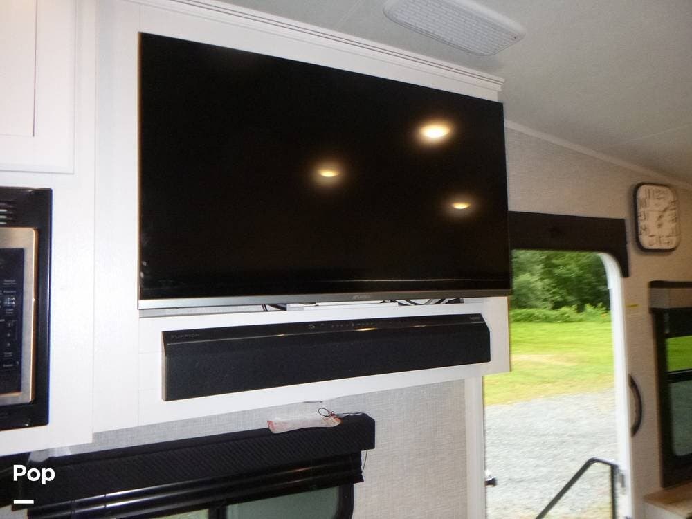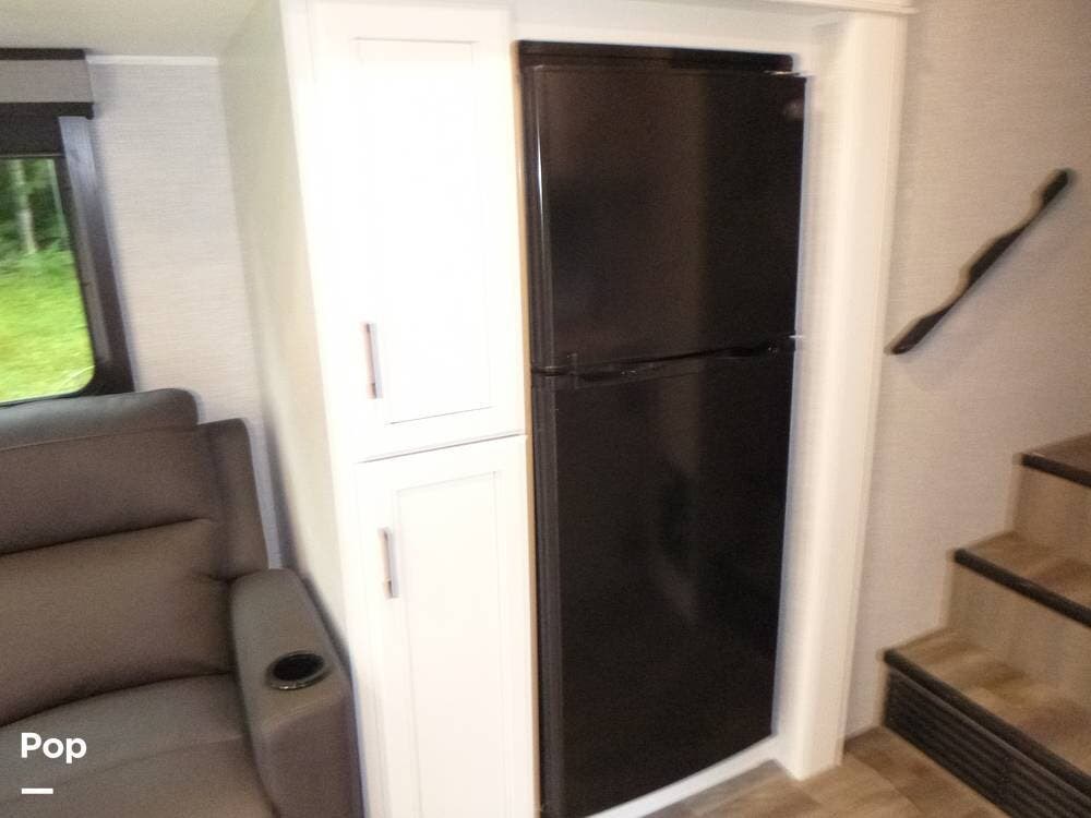 The living space is warm and inviting, featuring theater seating and a cozy dinette, perfect for family meals, game nights, or curling up with a movie after a day outdoors. At night, retreat to your private master bedroom, complete with a comfortable walk-around queen bed and ample storage for everything you bring along.