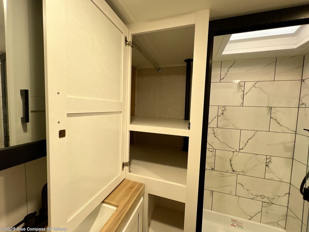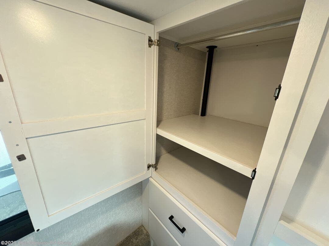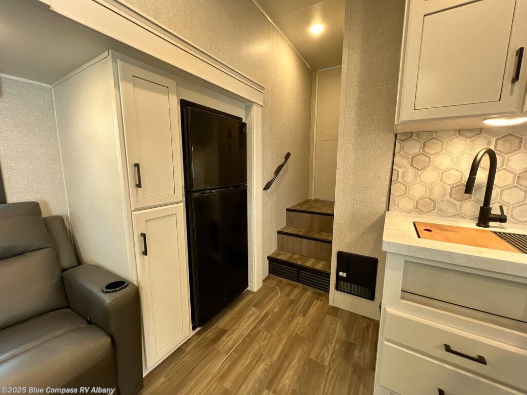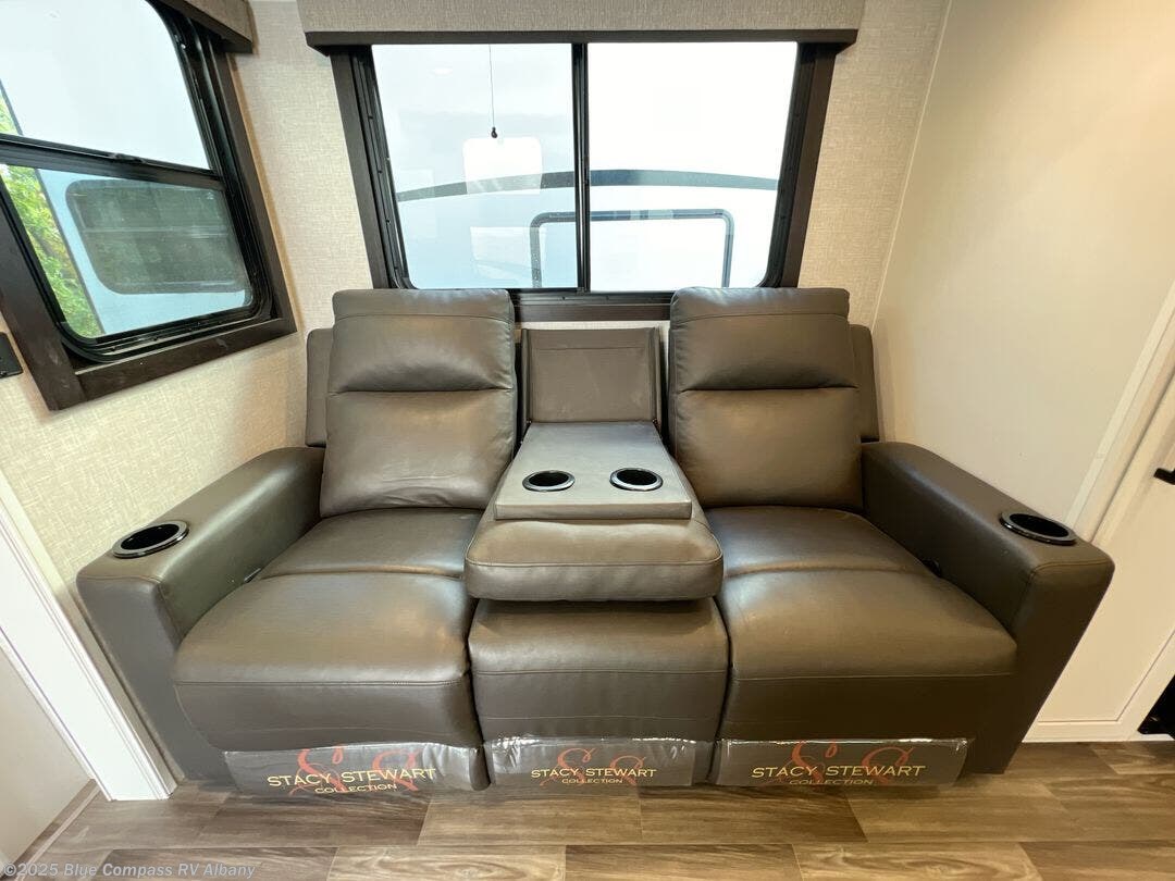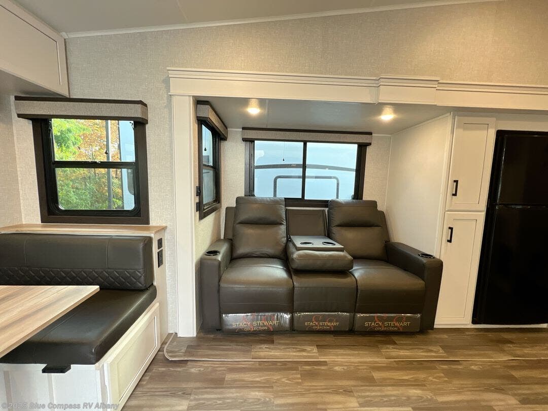 You'll have everything you need in this fifth wheel for enjoyable trips to the lake. Once you arrive at your destination, set up the 16' power awning with LED lights, grab the fishing poles from the pass-through storage, and relax with a cold drink. And there is a Jayport with LP Quick Connect if you want to add the optional outside griddle. You and your group can head inside to play a game around the U-shaped dinette or relax on the theater seat across from the TV. The full kitchen includes a black 17" range, a GE microwave, plus a 12V refrigerator for perishables, and the full bath will let you clean up each day. When you're ready to call it a night, head to the front private bedroom for a great night's rest on the queen bed with dual wardrobes, while your guests sleep on the dinette!
