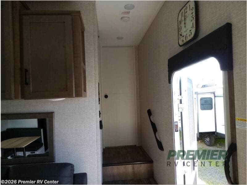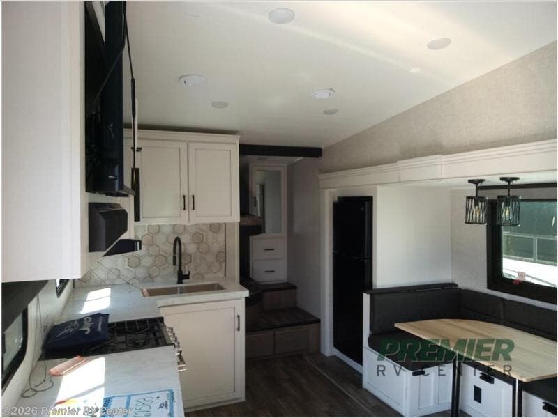 If you're needing a fifth wheel with more sleeping space, this unit will be perfect for you! There are double-size bunks in the back with a wardrobe for your guests' things and TV prep if you want to add a TV here. The front private bedroom up front will have you feeling right at home with its queen bed and dual wardrobes, and any additional guests you have can sleep on the U-shaped dinette within the slide out. There is also a theater seat here where you can relax with a good book in the evenings. The Jayport with LP Quick Connect outside will let you add the optional griddle, and the 19' power awning will provide shade during the day!