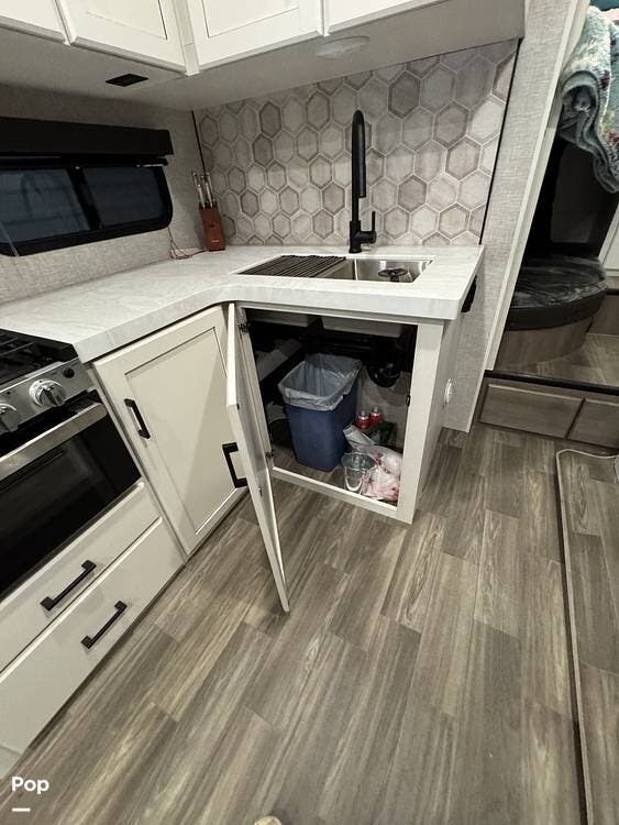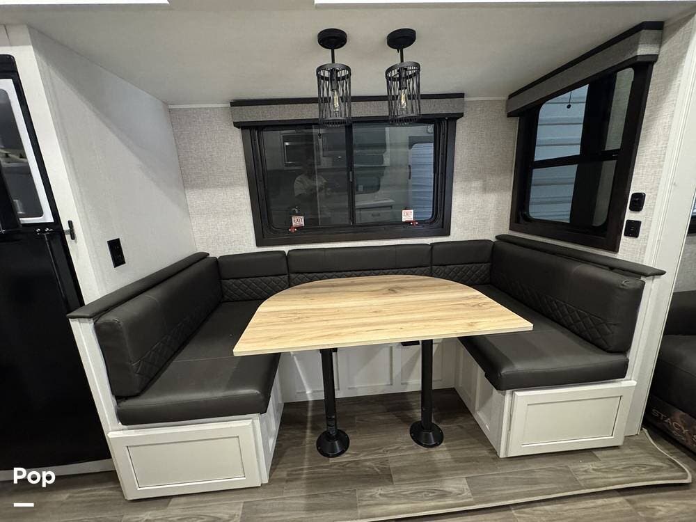 Step inside and you'll be surprised by the spacious feel. The slide-out living area features theater seating and a U-shaped dinette, perfect for relaxing, dining, or entertaining after a day of adventure.