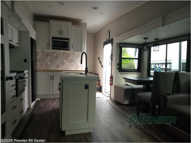With any Eagle HT fifth wheel by Jayco you will enjoy a smooth drive thanks to the 4 Star Handling Package, Goodyear Endurance tires, and MORryde CRE-3000 rubberized suspension. The Customer Value Package includes amenities that are sure to make camping easier than ever, like the 60K on-demand water heater, Keyed-Alike lock system, electric awning with integrated LED lights, and more. Handcrafted and glazed door/drawer fronts will make your space feel more like home, along with residential vinyl flooring throughout, motion activated LED lights, and blackout roller shades with reflective side throughout to keep the sun out when you want to sleep in. The HELIX Cooling System features Jayco's exclusive insulated dual duct design, directional and closeable A/C vents, and larger return air vents with user friendly filters to keep your crew comfortable all summer long. Choose an entry-level Eagle HT fifth wheel today!