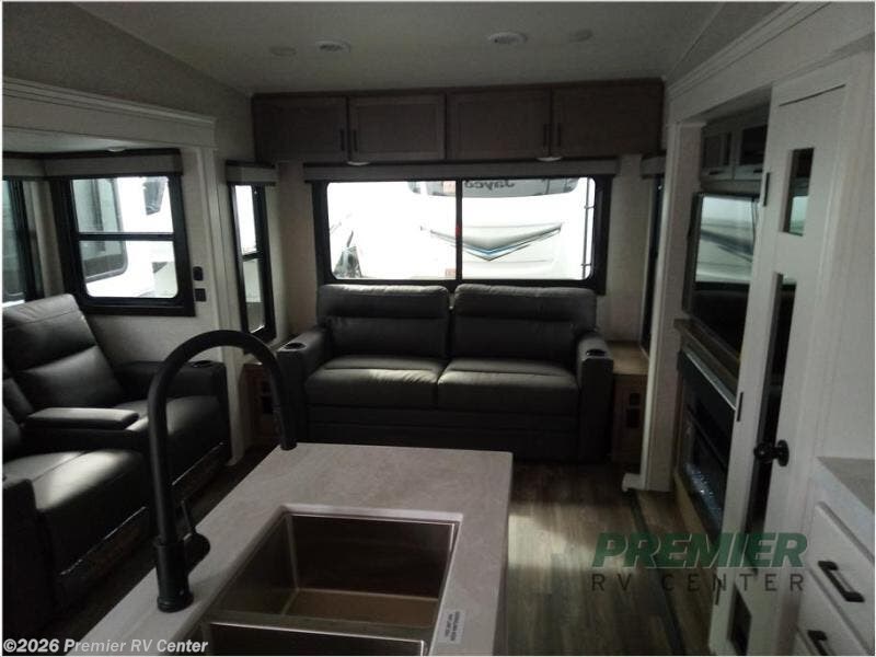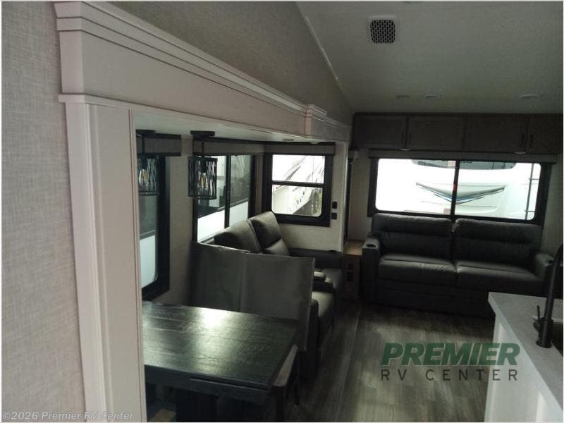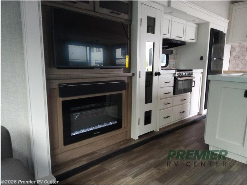You will love how much interior space you have in this fifth wheel thanks to the dual opposing slides in the kitchen/living area! While your crew is relaxing on the theater seat or tri-fold sofa, you can prepare dinner on the 17" range with edge to edge grates. There is also an entertainment center and fireplace across from the theater seat for easy viewing, and the table and chairs with a bench will be the perfect place to play a board game at. Head to the front to enjoy the private bedroom with a queen bed, and the full bath is close by for easy nighttime use!