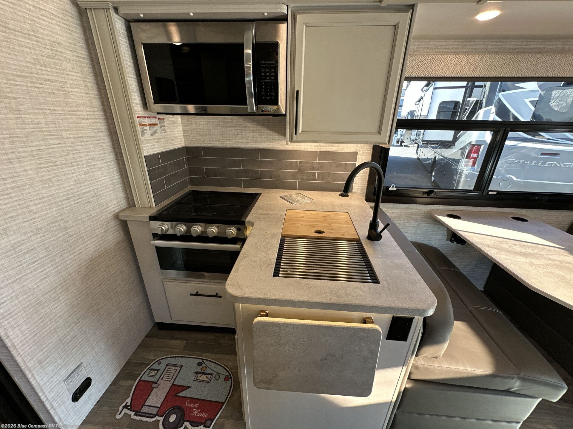 Trips across state lines just got sweeter in this motorhome for five to six. The swivel captain's seats can become a part of the living area once you park, and your guests can get comfortable on the 42" x 70" booth dinette or 68" jackknife sofa. There is a cab-over bunk the kids will love, and the LED HD Smart TV will allow you to enjoy movies. The chef of your group can prepare meals on the Furrion all-in-one cooktop and oven, and leftovers can go in the 10 cu. ft. 12V refrigerator. You will feel right at home in the bedroom suite with its king bed slide out, large wardrobe, and access to the rear corner bathroom. Get started on your getaway today in this cozy Class C motorhome!