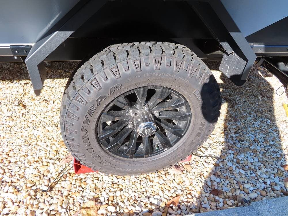 This camper features 16-inch Goodyear American-made all-terrain tires with self-adjusting electric brakes. The 55-gallon fresh water tank makes camping even nicer!