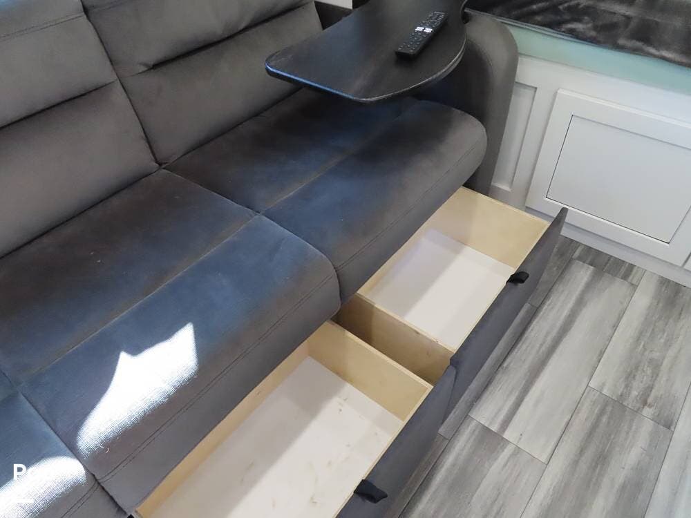 The layout is perfectly functional, with a 54'x80' double bed in front and a large full bath with a radius shower in the back. The bathroom is plenty bright, with light coming in from the large skylight.