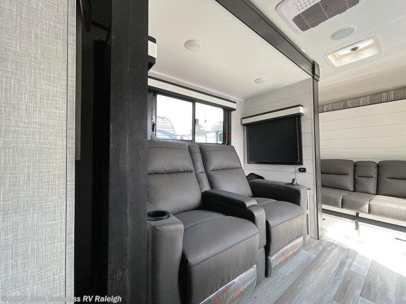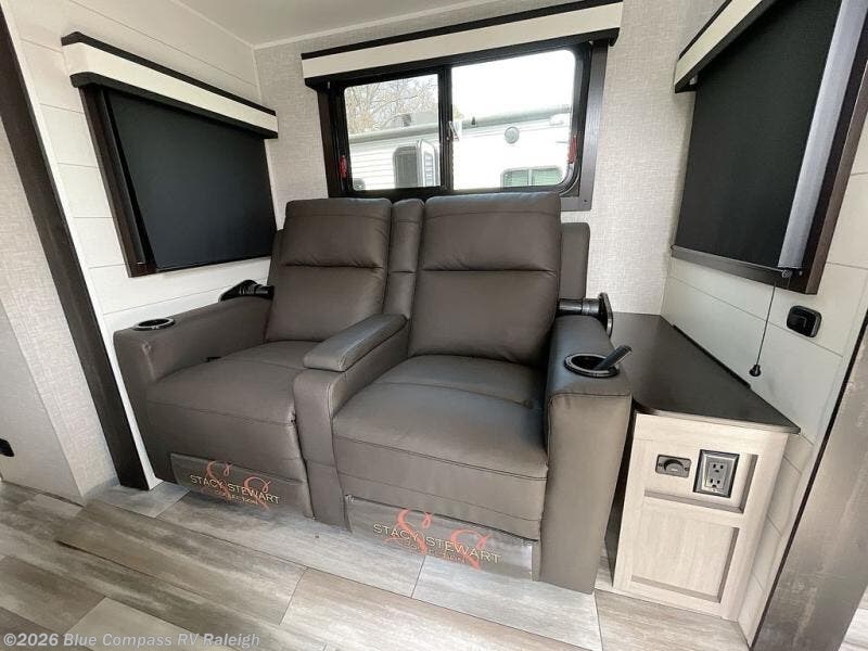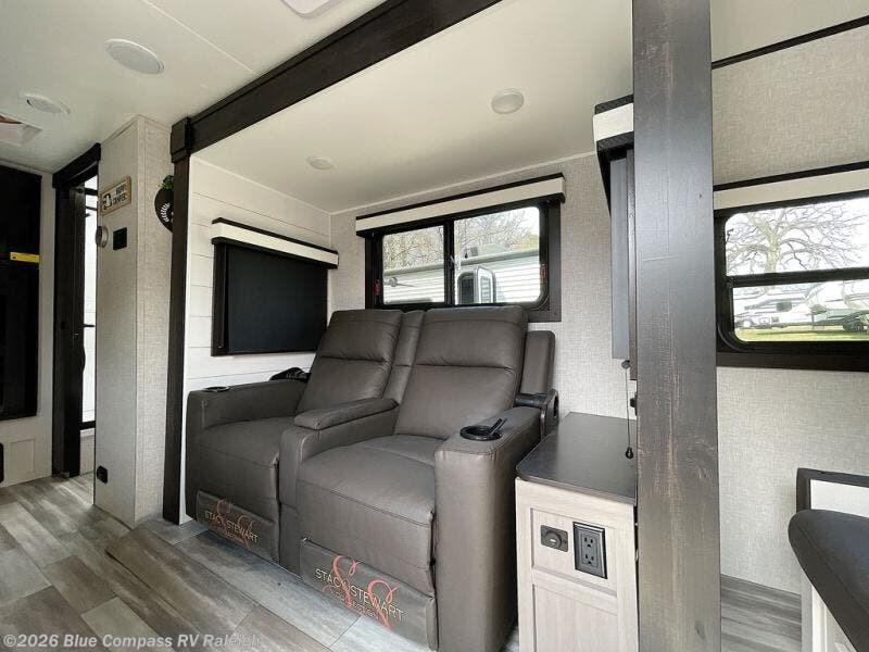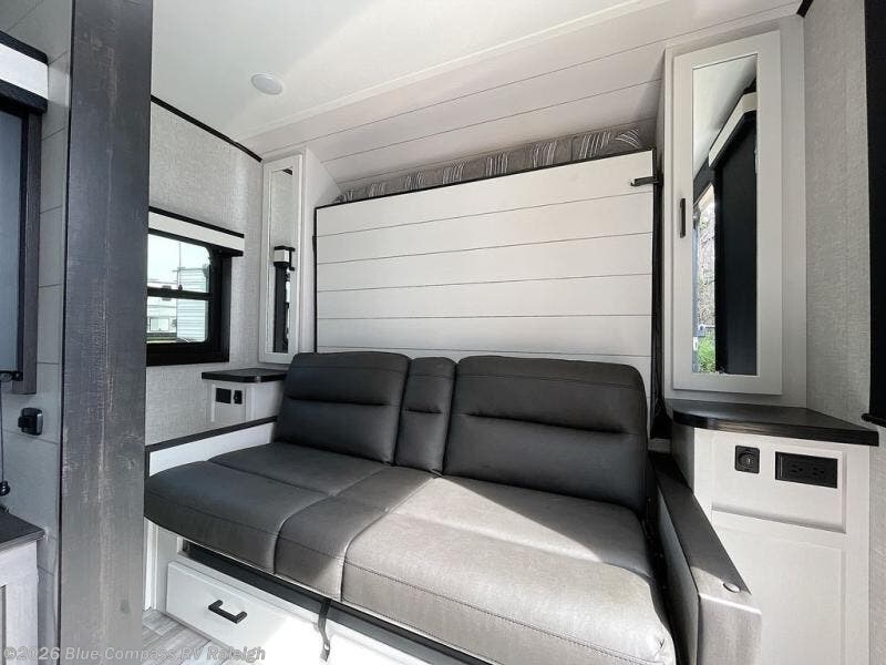 This travel trailer offers a lot of possibilities! During the day, relax in the spacious front living area with a jackknife sofa plus a pair of theater seats, both positioned for a great view of the entertainment center. A fully equipped kitchen with dual sinks, microwave, and three-burner range makes meals easy, and the theater seats have swing-out trays for you to dine. At night, pull down the 60" x 75" Murphy bed for a great night's sleep! wardrobes on either side of the bed provide plenty of storage for your clothing. The rear corner bath is convenient and private, and offers a linen closet plus a medicine cabinet for additional storage capability. Outside you will be sheltered from the sun beneath the 15' awning, and there is an exterior griddle for pancakes in the morning!