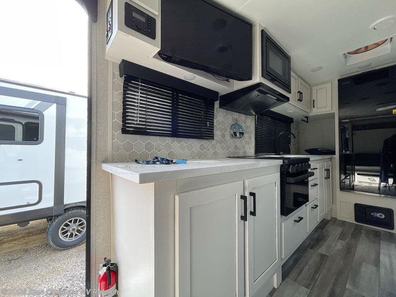 With any Jay Feather travel trailer by Jayco, you will enjoy lightweight towing, convenient exterior amenities, and at-home comforts inside! The Overlander 1 Solar Package included within the Jay Sport Package comes with a 200W solar panel and a 30-amp digital controller so you can enjoy some off-grid camping. There is also a modern graphics package with a dual-colored sidewall, LCI Solid Step fold-down aluminum tread steps on the main entry door, and Climate Shield 0 -100° F tested weather insulation package that will allow you to camp in all sorts of climates. The Customer Value Package will make time outdoors easier than ever with an outside shower, a power tongue jack and a Rock Solid stabilizer system, plus American-made nitro-filled Goodyear tires with self-adjusting electric brakes. More exterior features include a Keyed-Alike locking system, marine grade exterior speakers with blue LED accent lighting, a Magnum Truss roof system, and the list goes on! And we haven't even touched on the interior comforts, like the residential style kitchen countertops and vinyl flooring throughout, decorative backsplash, handcrafted hardwood door/drawer fronts, and multiple USB charging ports to keep you going!