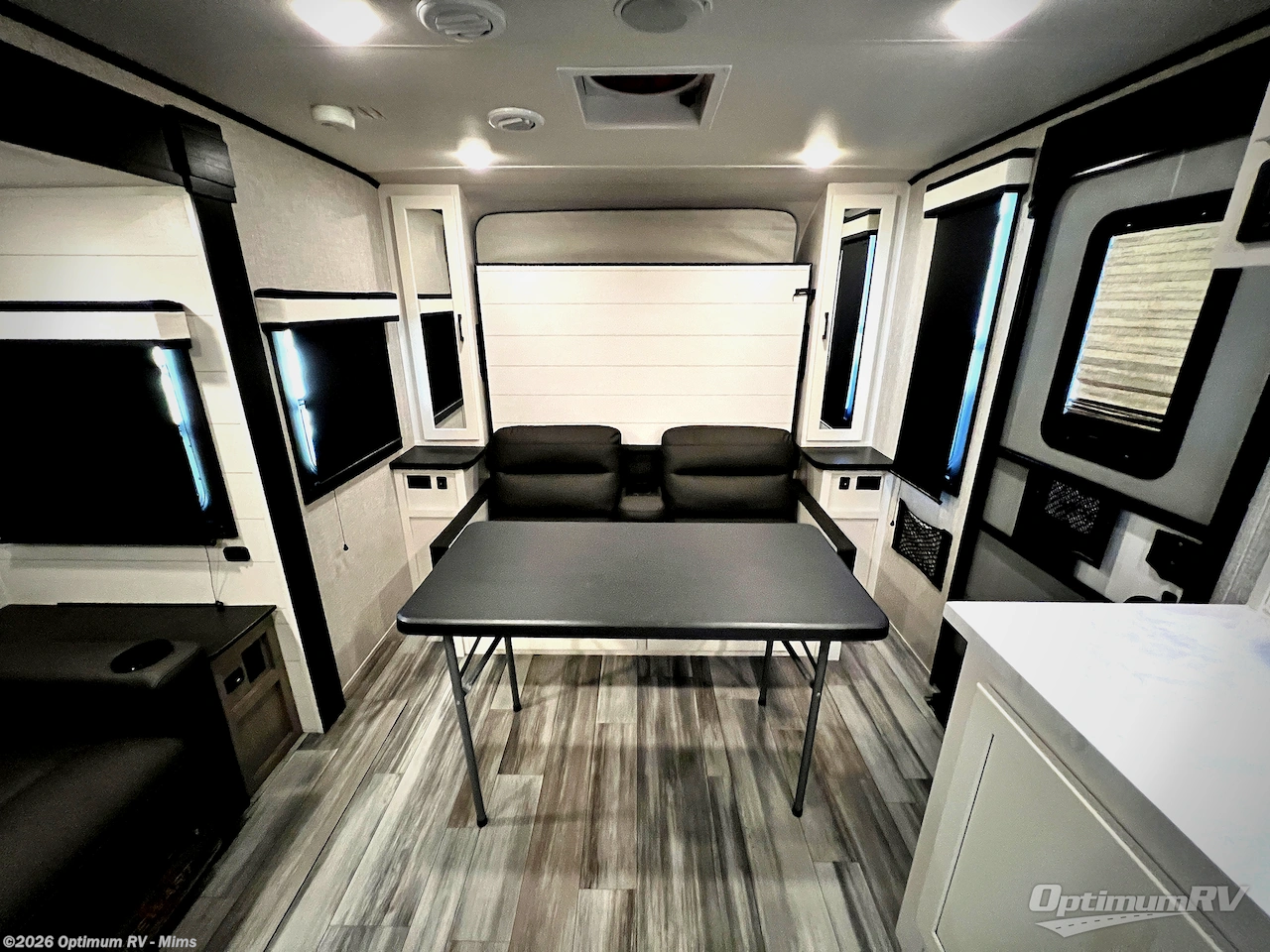 This travel trailer offers a lot of possibilities! During the day, relax in the spacious front living area with a jackknife sofa plus a pair of theater seats, both positioned for a great view of the entertainment center. A fully equipped kitchen with dual sinks, microwave, and three-burner range makes meals easy, and the theater seats have swing-out trays for you to dine. At night, pull down the 60" x 75" Murphy bed for a great night's sleep! wardrobes on either side of the bed provide plenty of storage for your clothing. The rear corner bath is convenient and private, and offers a linen closet plus a medicine cabinet for additional storage capability. Outside you will be sheltered from the sun beneath the 15' awning, and there is an exterior griddle for pancakes in the morning!