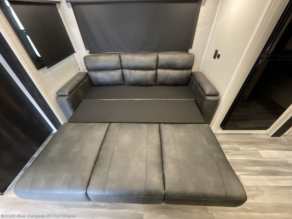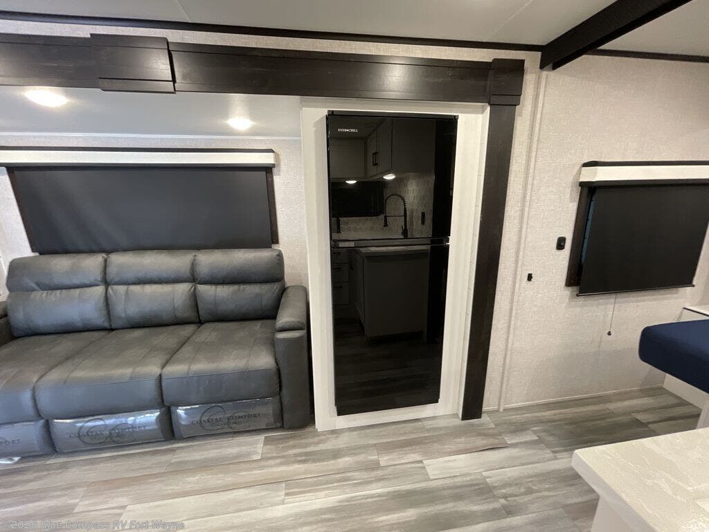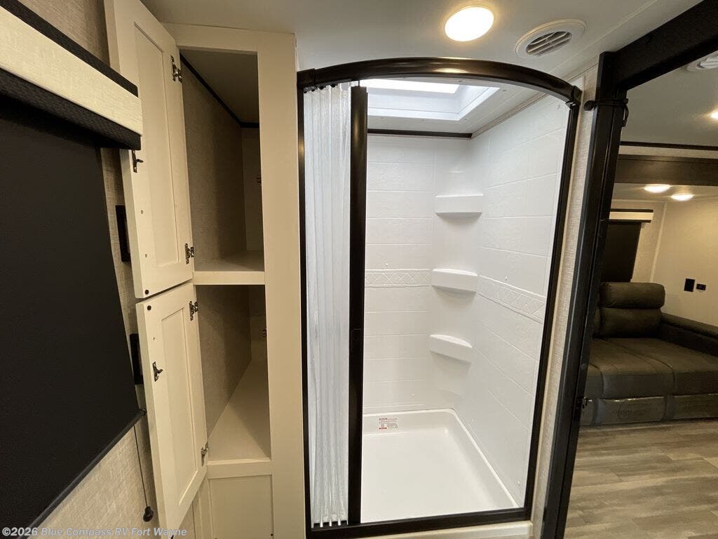 Whether you are a couple or a larger group, this trailer offers a spacious main living and kitchen area as well as rear bathroom for privacy. You will also find linen storage and ample counter space for toiletries. The space saving door even gives you more floor space in both the bathroom and the main area. The single slide holds the U-shaped dinette and 10 cu. ft. 12V refrigerator for even more floor space, the L-shaped kitchen area allows the cook their own space to make meals, and the walk-in pantry provides perfect for extra goodies on those longer camping trips. The front private bedroom provides privacy as well with its own space saving door, and you can sleep like royalty with a queen bed at night.