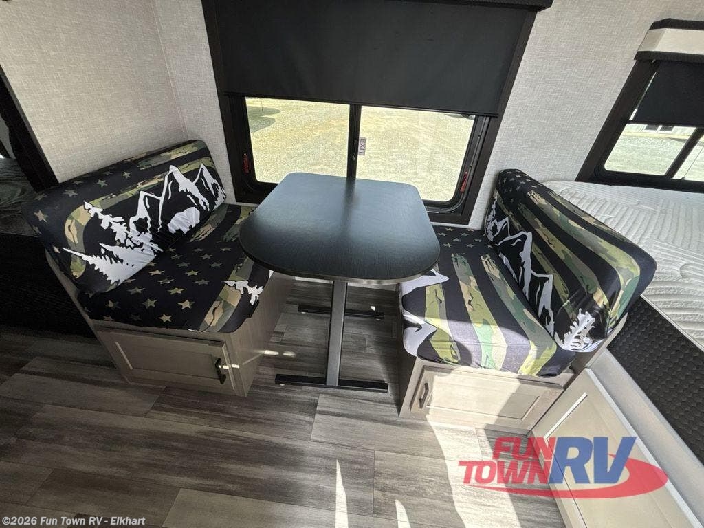 If you've been looking for a lightweight travel trailer with more sleeping space, your search is over with this model! There are bunk beds in the back near the full bath for convenience, a front 54" x 74" queen bed, plus a booth dinette that will double as dining and sleeping space. This model also includes overhead compartments for your belongings, plus exterior storage for you fishing poles or tackle boxes and a cargo door under the bunks for even more storage space!