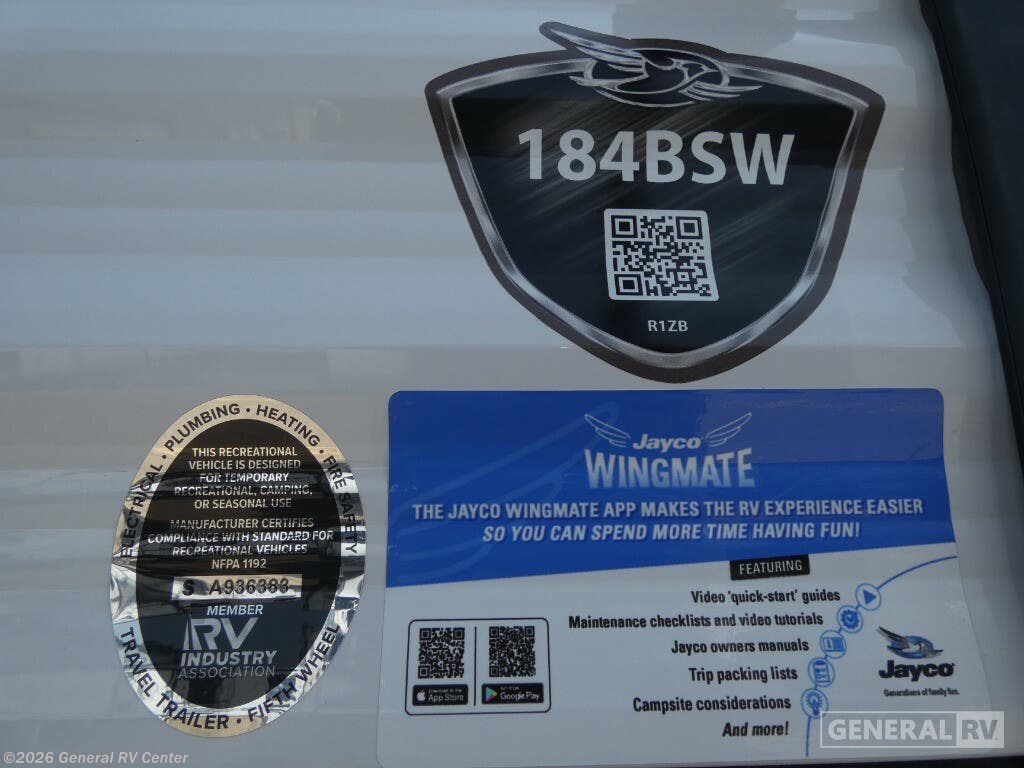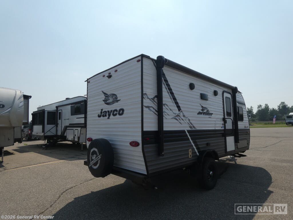 Experience the freedom of the open road with the 2024 Jayco Jay Flight SLX 184BS. This compact yet spacious travel trailer is your perfect getaway companion, designed to comfortably accommodate up to six adventurers. With a cozy queen bed and versatile convertible sleeping arrangements, plus two bunks, everyone can enjoy a restful night's sleep. The smartly designed center kitchen and living area make meal prep and relaxation a breeze, featuring a mid-size refrigerator and a two-burner cooktop for all your culinary needs. The Jay Flight SLX 184BS also boasts practical features like a rear bath with a shower curtain for added privacy. Its lightweight design, with a dry weight of just 3350 lbs, makes it easy to tow, while the single slide-out expands your living space for added comfort. Enjoy the great outdoors under the 10-foot powered retractable awning, perfect for sunny days or light rain. With a fresh water capacity of 20 gallons and ample gray and black water storage, your adventures can be both extended and comfortable. Visit your nearest General RV dealership to explore this charming travel trailer and start planning your next adventure today!