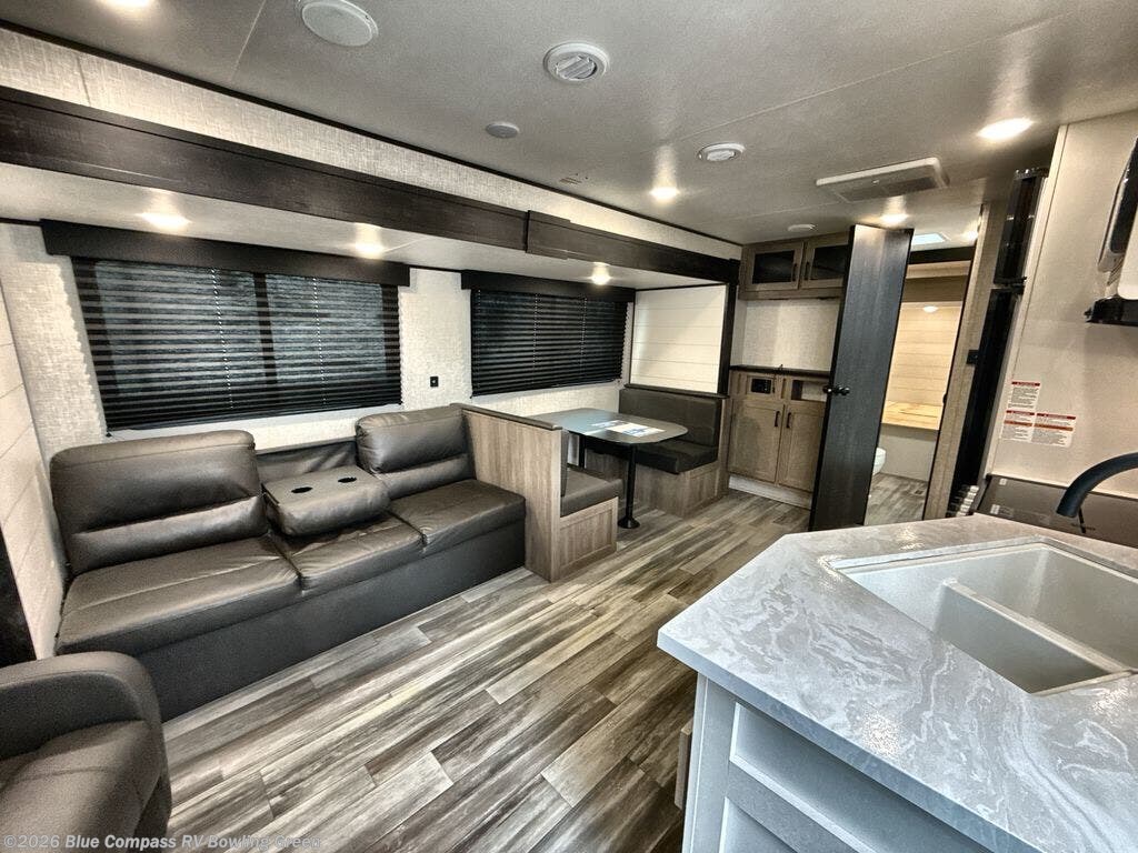 You can comfortably sleep up to six people in this trailer thanks to the RV queen bed in the front bedroom, plus the booth dinette and jack-knife sofa in the main living area! The chef of your crew will have a three burner cooktop and microwave oven to prepare meals, and everyone can store their favorite drinks in the 8 cu. ft. 12V refrigerator. The walk-through bath is spacious and includes a radius shower, toilet, a sink, and linen closet and is the full width of the unit. The outside storage will let you bring along camp chairs and games, fishing poles and more, plus the 18' 3" power awning with LED lights will create a nice place to gather in the evenings!