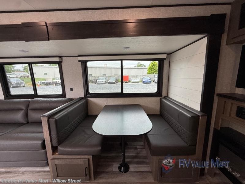 When you want to travel and see new places, this trailer gives you the flexibility to sleep two to four, plus offers a full walk-through bathroom with access from the main area and the front private bedroom. You will also appreciate having a second entry/exit door in the bedroom, a walk-around queen bed, plus dual wardrobes giving you your own side of the bed. The bathroom also has a radius shower and linen storage. The kitchen includes full amenities to make your own meals, and a pantry to keep your dry goods and snacks. You will love the rear swivel rockers with table in between to place your drinks, and the jackknife sofa plus booth dinette offer more seating, sleeping space, and extra floor space since they are within a slide.
