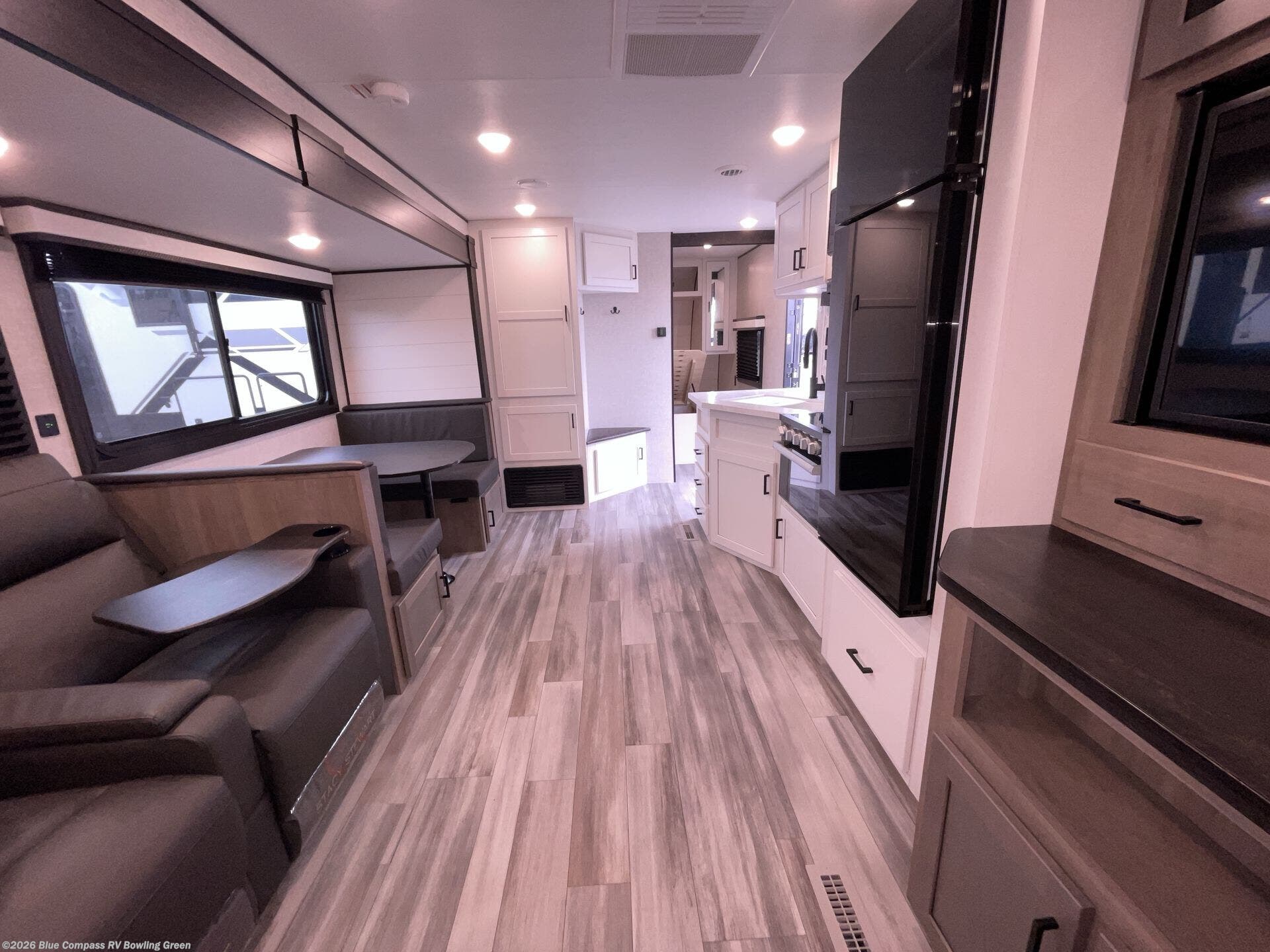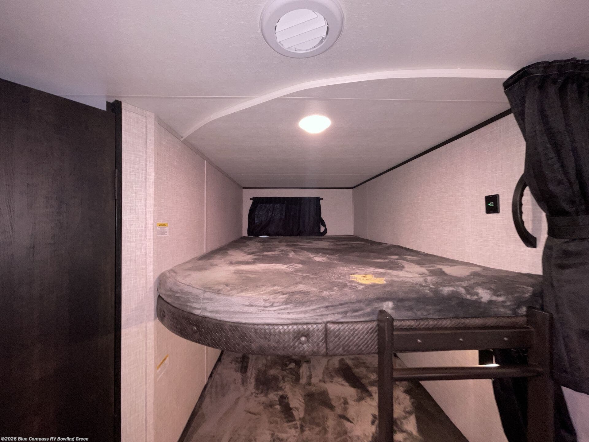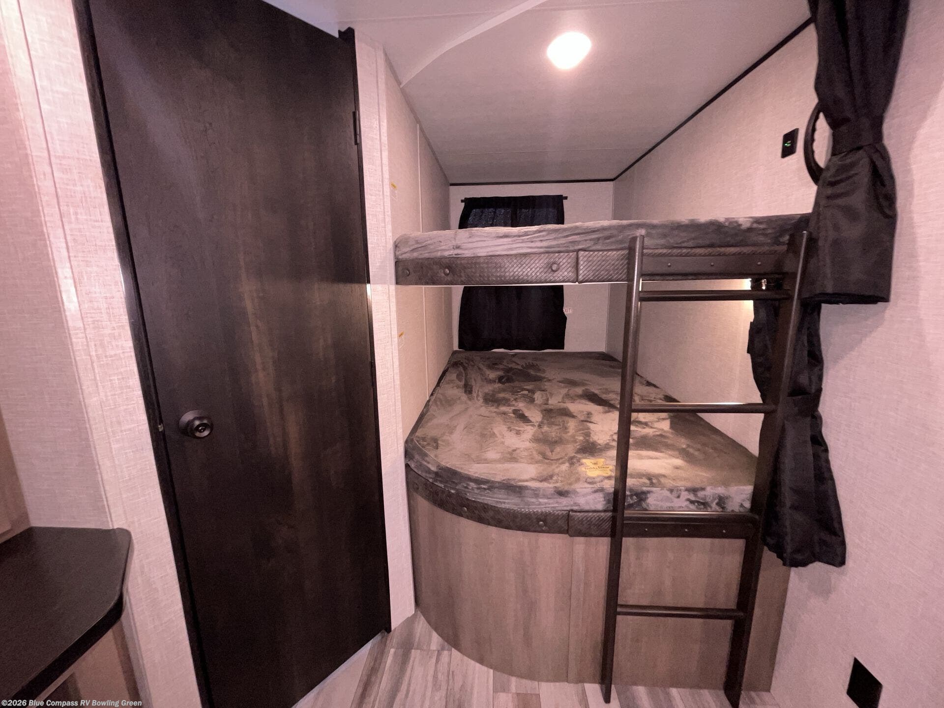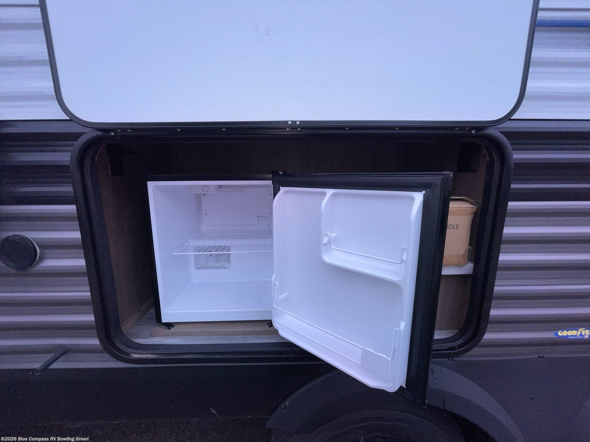 The whole family can get together in this travel trailer! You can sleep on the queen bed in the front private bedroom and the kids can sleep on the 48" x 80" bunk beds with a ladder. The dual entry rear corner bathroom is easy to access even from the outside with one of the dual entry doors to the unit. With a booth dinette and jackknife sofa slide, you will have more walking around space. There is even a bench with storage to keep your shoes out of the way. You also have an outside refrigerator to enjoy a cold beverage without having to go back inside!