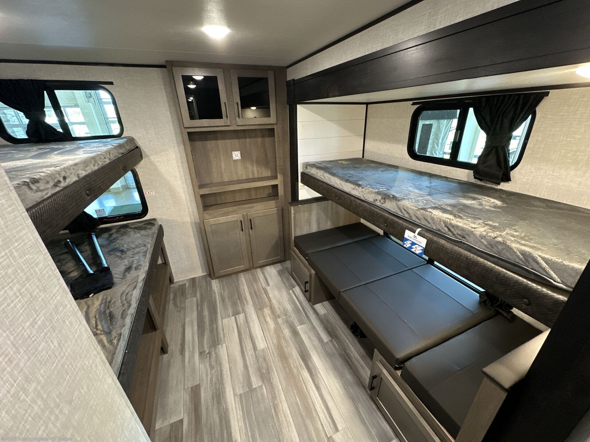 Get ready for a whole lot of memories being made when you have this trailer at the campgrounds! From the kids telling stories at night while they sleep on the three bunks and the booth dinette in the rear bunkhouse to you relaxing on the jackknife sofa and U-shaped dinette. Both furnishings offer more sleeping space when the whole family joins you. And the slide out gives you more floor space! The full bathroom has an interior and exterior entry for convenience, and the inside kitchen offers full amenities while the outside kitchen gives you more choices when cooking for everyone. You will also appreciate privacy in the front bedroom with dual access, two wardrobes and windows for views of the scenery.