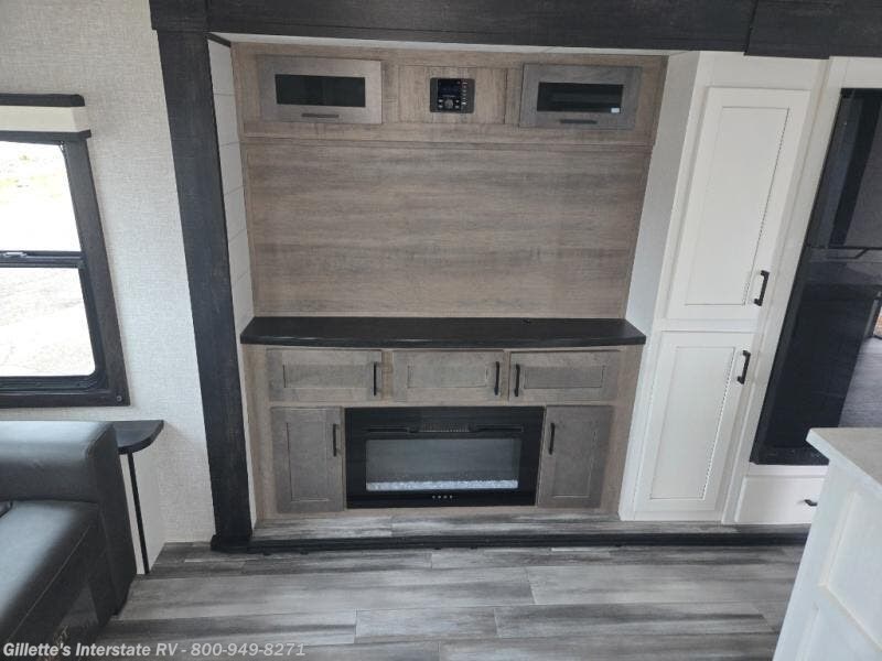 Enjoy a relaxing weekend getaway in this travel trailer! The dual entry bathroom with radius shower creates a front master suite with a queen bed slide, a dresser, and a front large wardrobe with storage space next to it that is prepped to add an optional washer and dryer. The chef will have an easy time preparing their best home cooked meals with the kitchen island, hutch, three burner cooktop, and 12V refrigerator. Enjoy your meals at the booth dinette then play a card game or transform it into an extra sleeping space. The rear living area has a rear jackknife sofa for a quick afternoon nap and theater seating across from the entertainment center with a fireplace for the perfect spot on movie night!