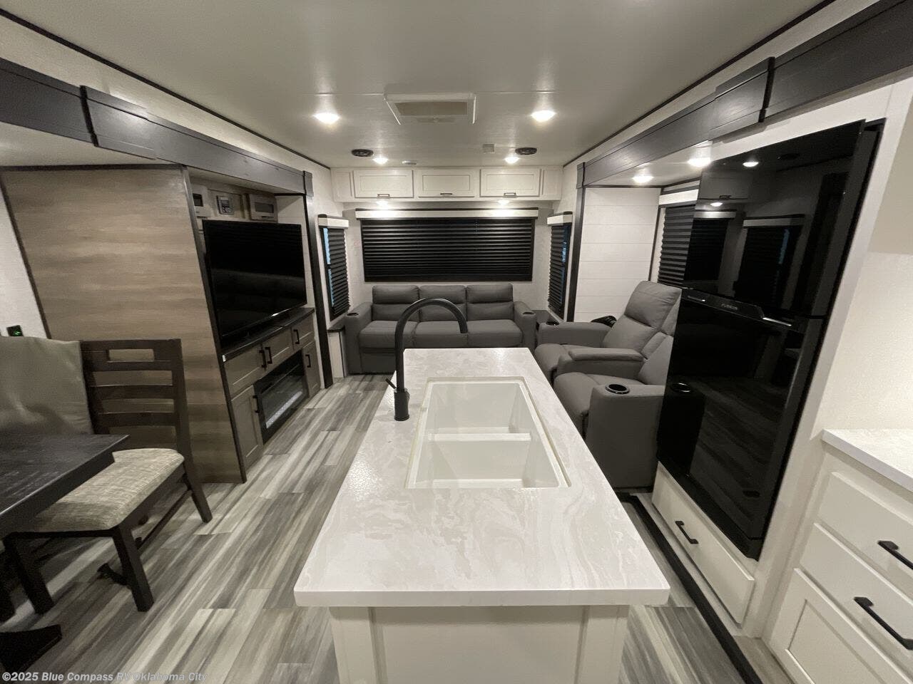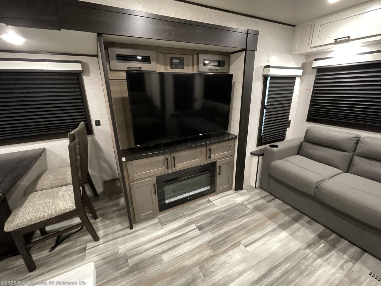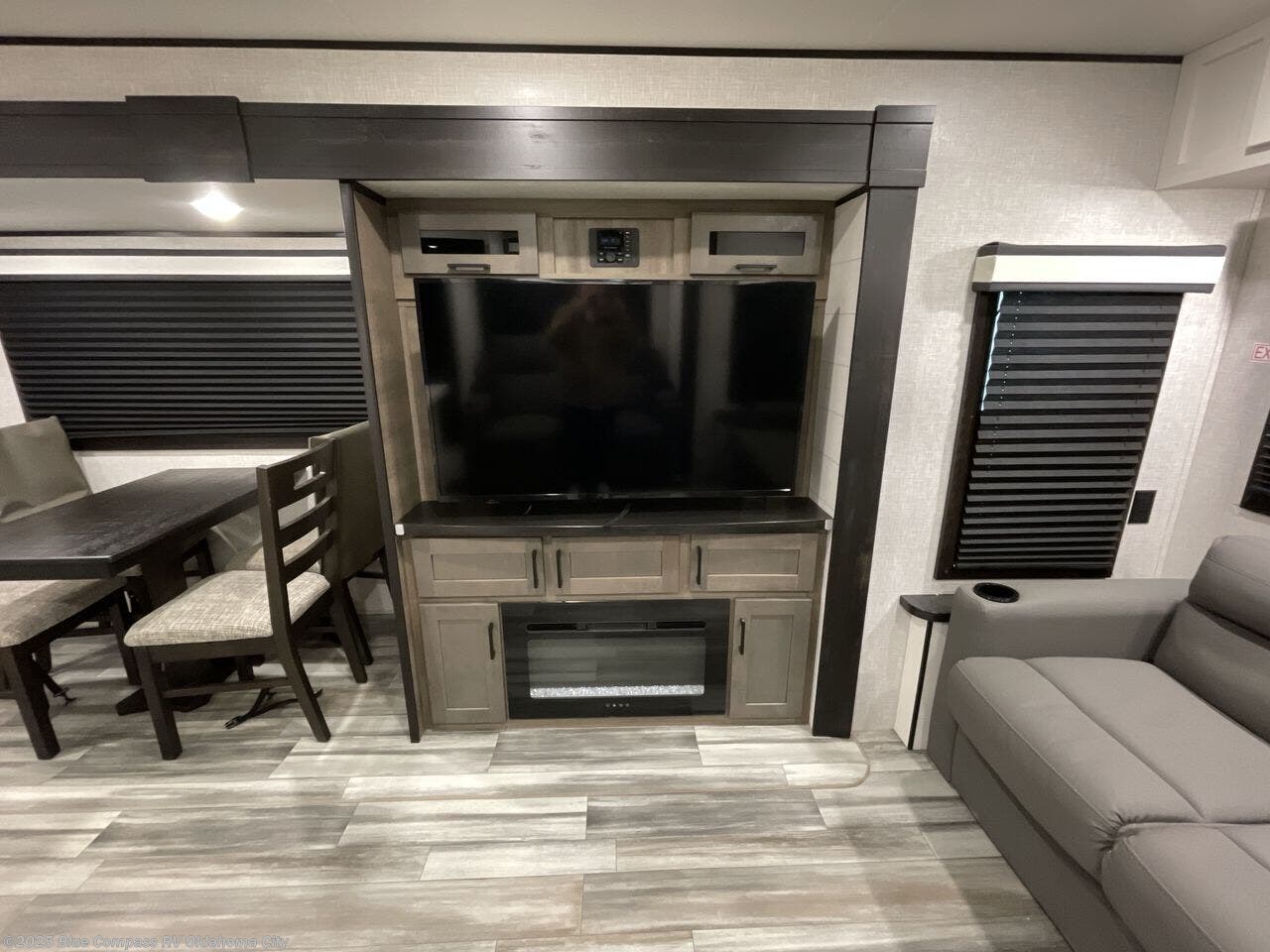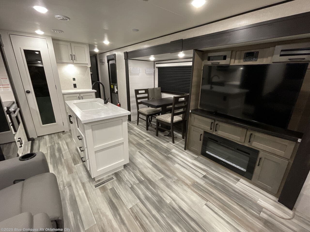 Take this travel trailer to all of your favorite campgrounds! The front private bedroom not only has a queen bed slide to lay your head on at night, but also a dresser and a front large wardrobe for your clothes, a storage area for an optional washer and dryer, and even an entrance into the dual entry bathroom with a radius shower to freshen up in each morning. Now that you're rested and cleaned, you can fill your belly with some delicious scrambled eggs on the three burner cooktop and a kitchen island with a double sink for easy clean up. Eat your meals at the free standing dinette and play a couple card games at night there too. You even have an outside kitchen with a refrigerator to keep your beverages cold while you play outside, and a rear living area with a jackknife sofa, theater seating, and an entertainment center with a fireplace!
