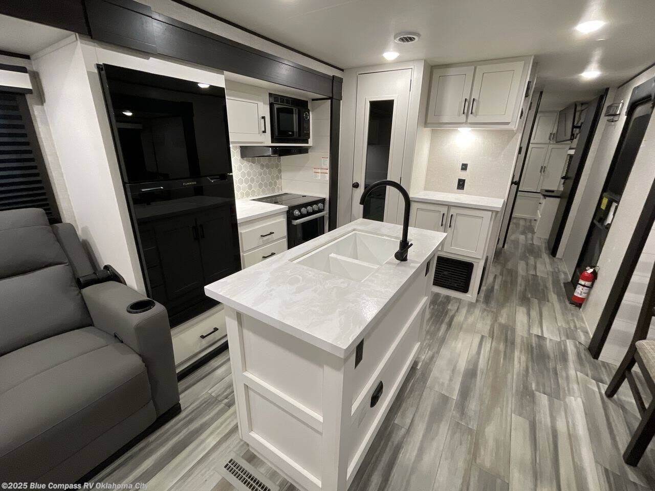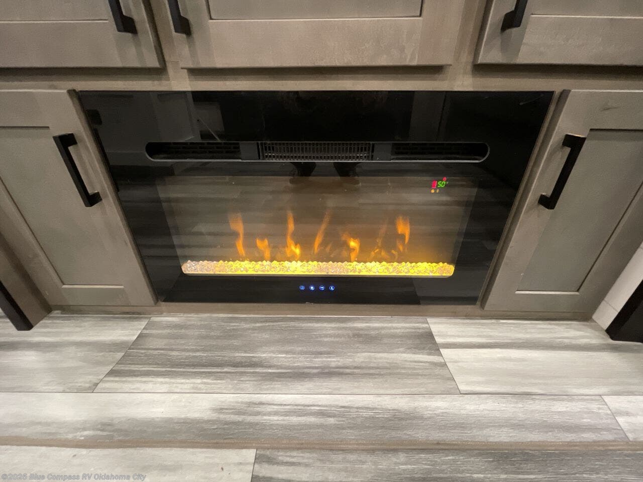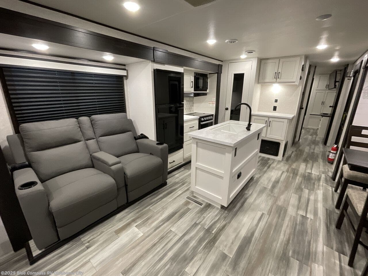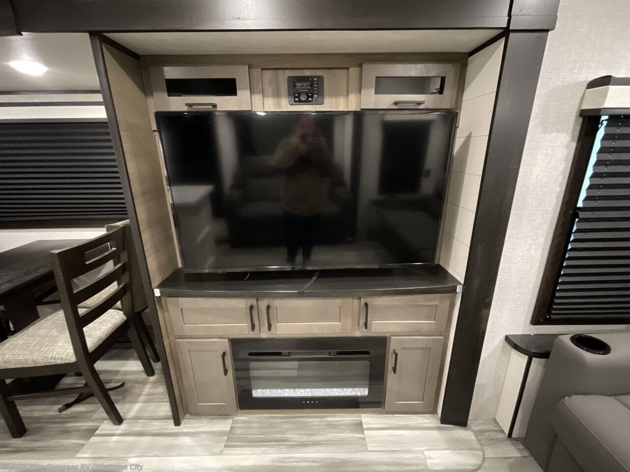 Take this travel trailer to all of your favorite campgrounds! The front private bedroom not only has a queen bed slide to lay your head on at night, but also a dresser and a front large wardrobe for your clothes, a storage area for an optional washer and dryer, and even an entrance into the dual entry bathroom with a radius shower to freshen up in each morning. Now that you're rested and cleaned, you can fill your belly with some delicious scrambled eggs on the three burner cooktop and a kitchen island with a double sink for easy clean up. Eat your meals at the free standing dinette and play a couple card games at night there too. You even have an outside kitchen with a refrigerator to keep your beverages cold while you play outside, and a rear living area with a jackknife sofa, theater seating, and an entertainment center with a fireplace!