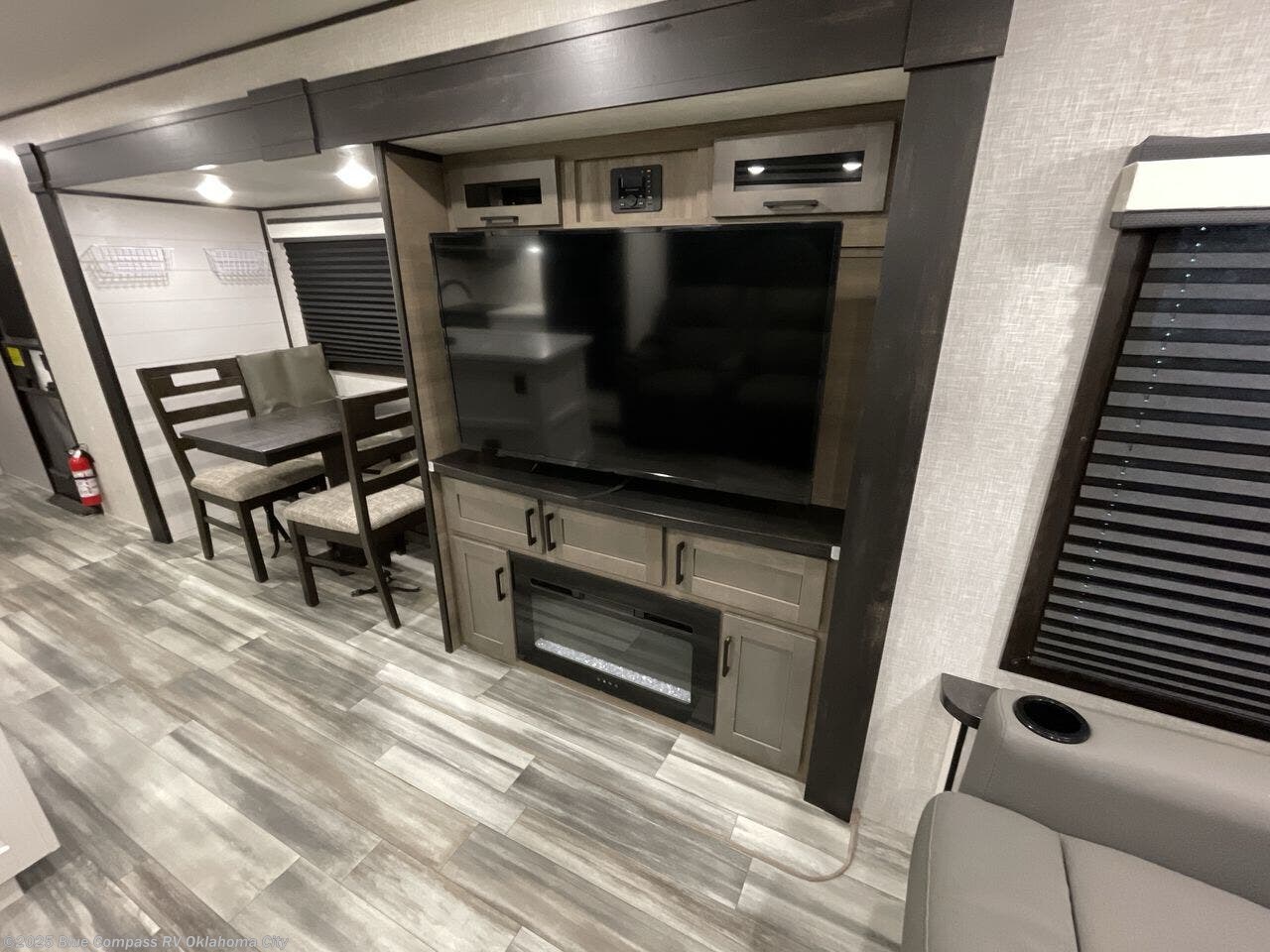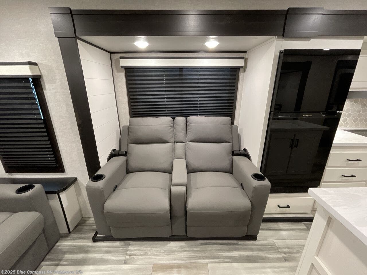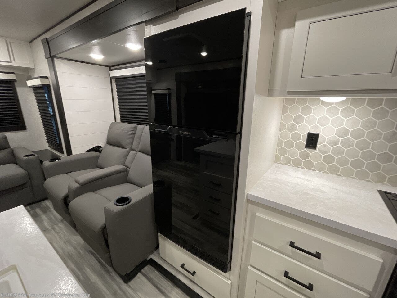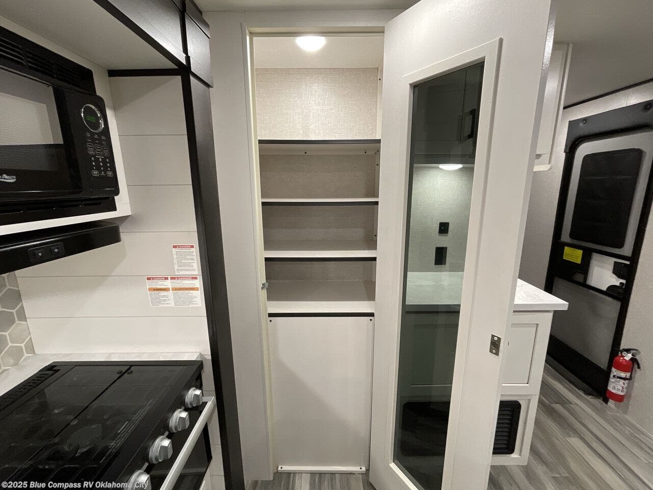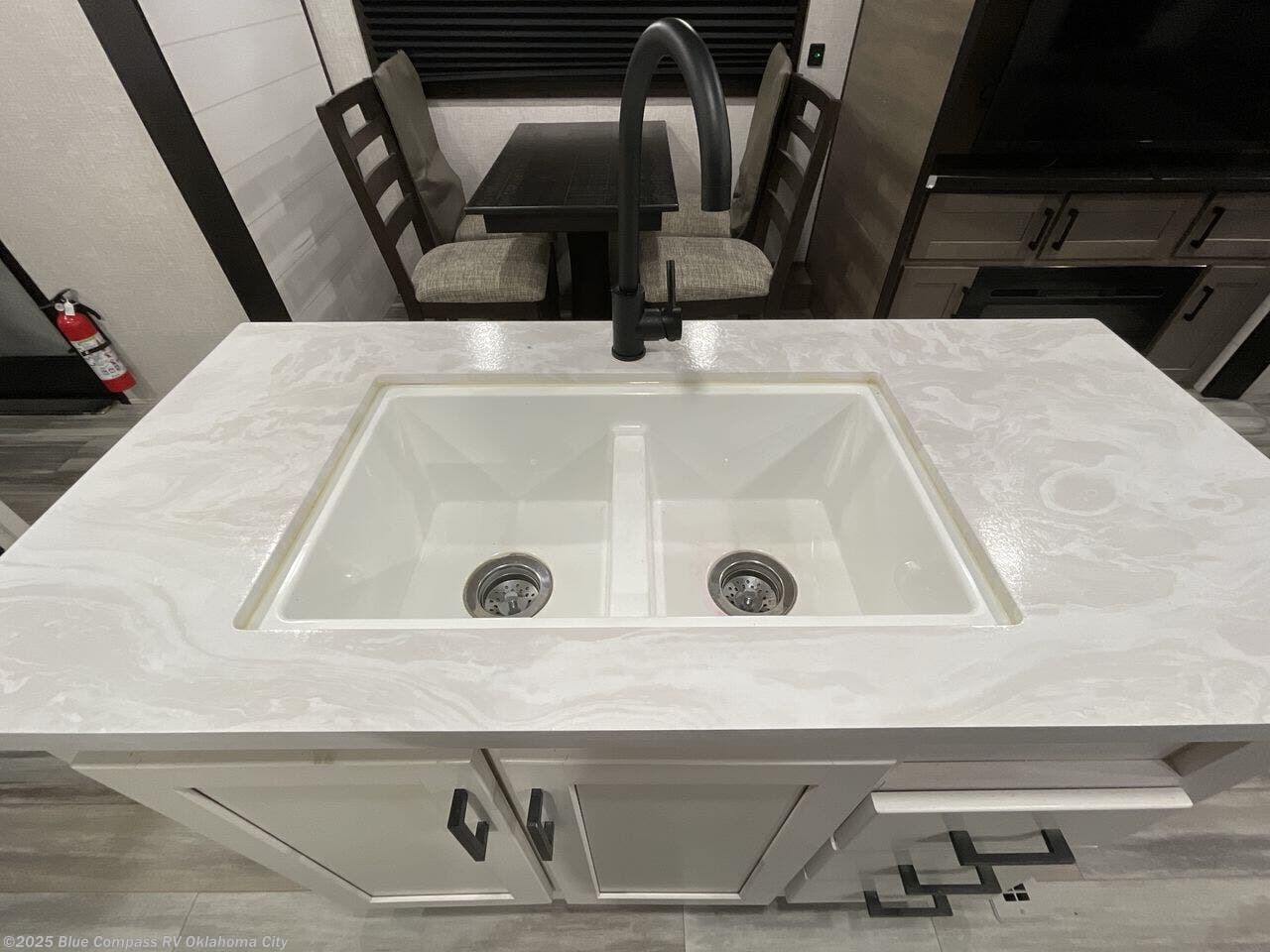 Take this travel trailer to all of your favorite campgrounds! The front private bedroom not only has a queen bed slide to lay your head on at night, but also a dresser and a front large wardrobe for your clothes, a storage area for an optional washer and dryer, and even an entrance into the dual entry bathroom with a radius shower to freshen up in each morning. Now that you're rested and cleaned, you can fill your belly with some delicious scrambled eggs on the three burner cooktop and a kitchen island with a double sink for easy clean up. Eat your meals at the free standing dinette and play a couple card games at night there too. You even have an outside kitchen with a refrigerator to keep your beverages cold while you play outside, and a rear living area with a jackknife sofa, theater seating, and an entertainment center with a fireplace!