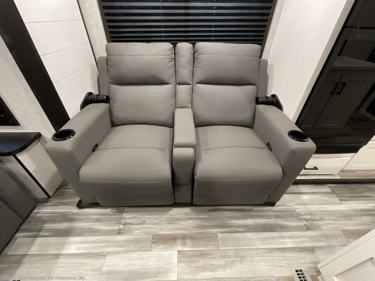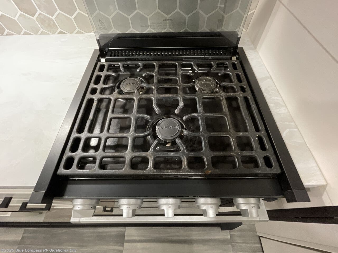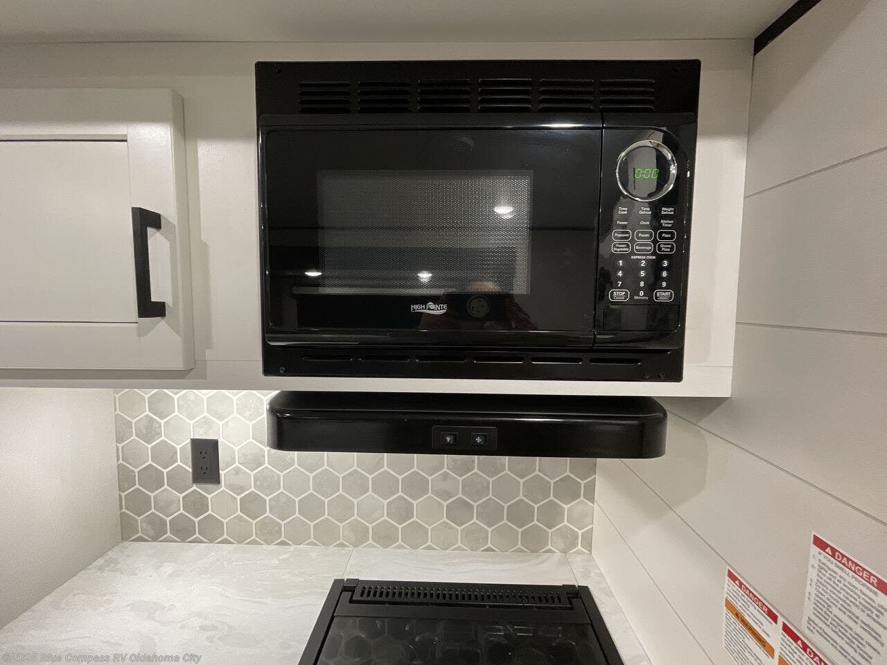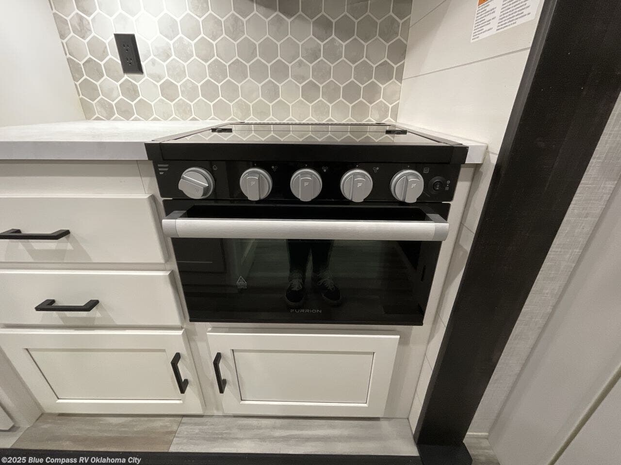 Take this travel trailer to all of your favorite campgrounds! The front private bedroom not only has a queen bed slide to lay your head on at night, but also a dresser and a front large wardrobe for your clothes, a storage area for an optional washer and dryer, and even an entrance into the dual entry bathroom with a radius shower to freshen up in each morning. Now that you're rested and cleaned, you can fill your belly with some delicious scrambled eggs on the three burner cooktop and a kitchen island with a double sink for easy clean up. Eat your meals at the free standing dinette and play a couple card games at night there too. You even have an outside kitchen with a refrigerator to keep your beverages cold while you play outside, and a rear living area with a jackknife sofa, theater seating, and an entertainment center with a fireplace!