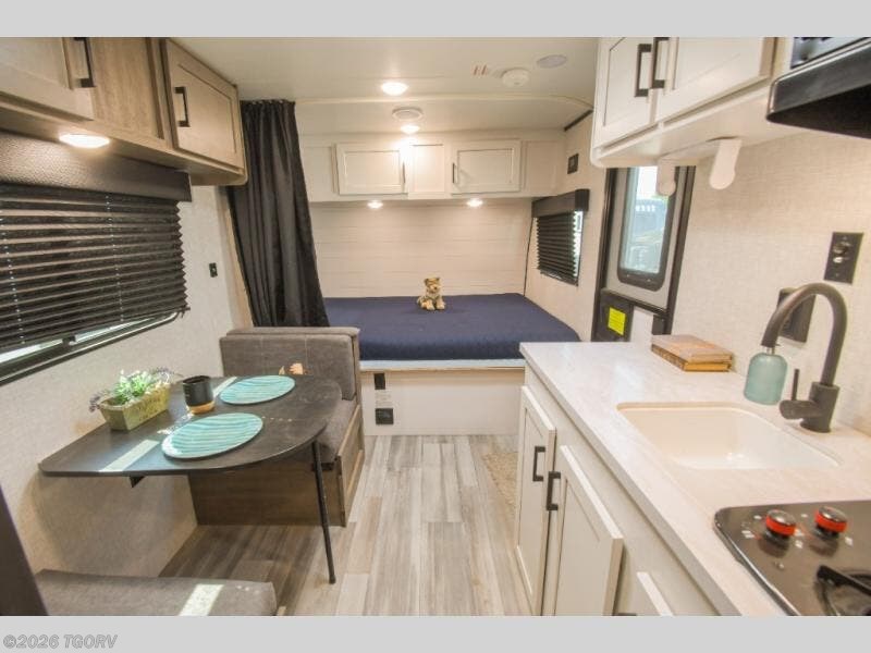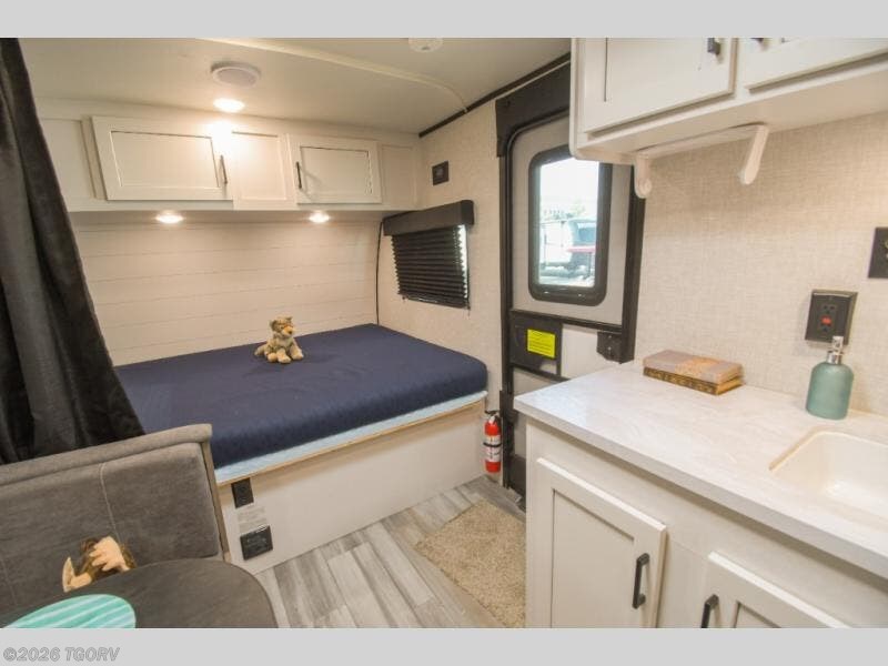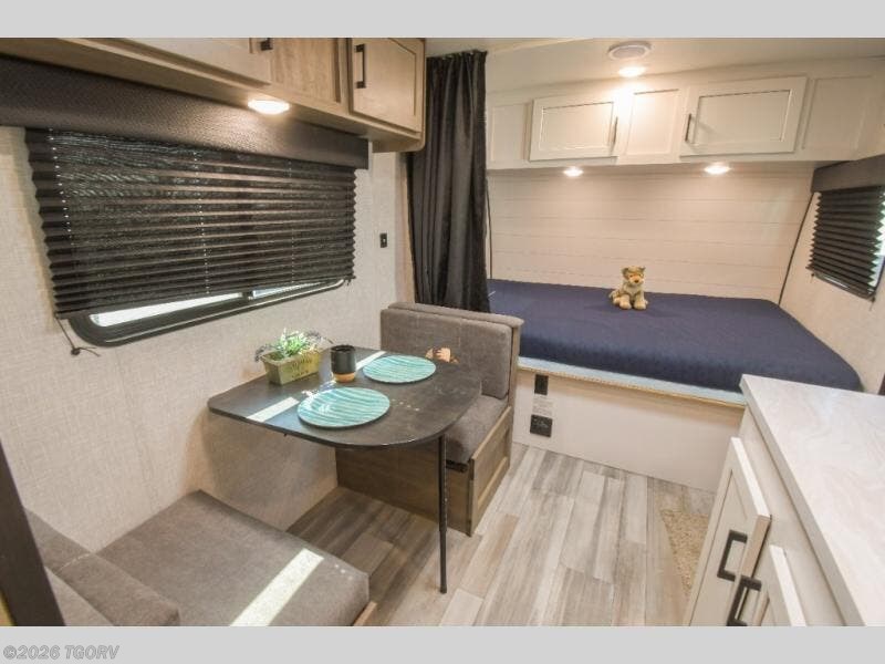 This Jay Flight SLX travel trailer offers you a queen-size bed for sleeping at night, and there is even a privacy curtain that you can draw to separate the bed from the rest of the trailer too. The 29" x 75" bunk beds are another sleeping location, and you can even create a bed for one more person by transforming the booth dinette. Overhead cabinets will help you keep your belongings organized, and the kitchen has a two-burner range, 8 cu.ft. 12V refrigerator, microwave oven, and a high-rise faucet at the sink to help you prepare meals.