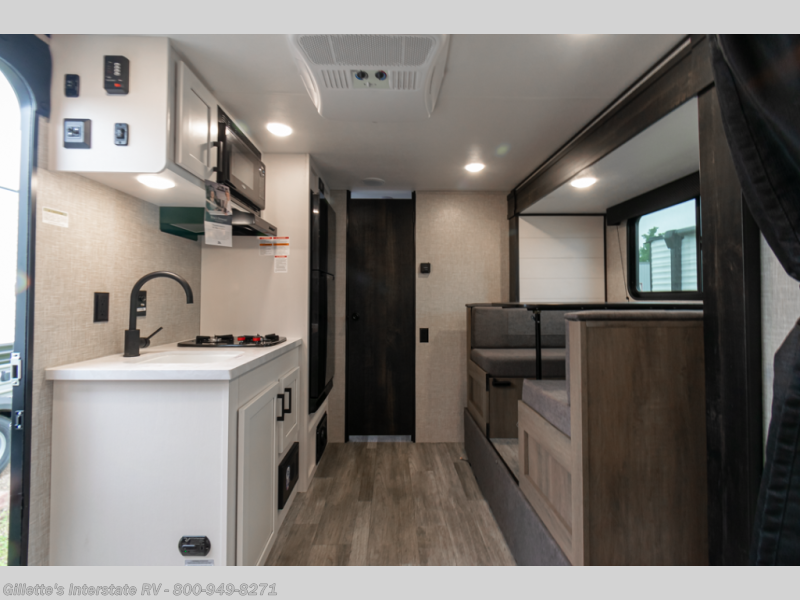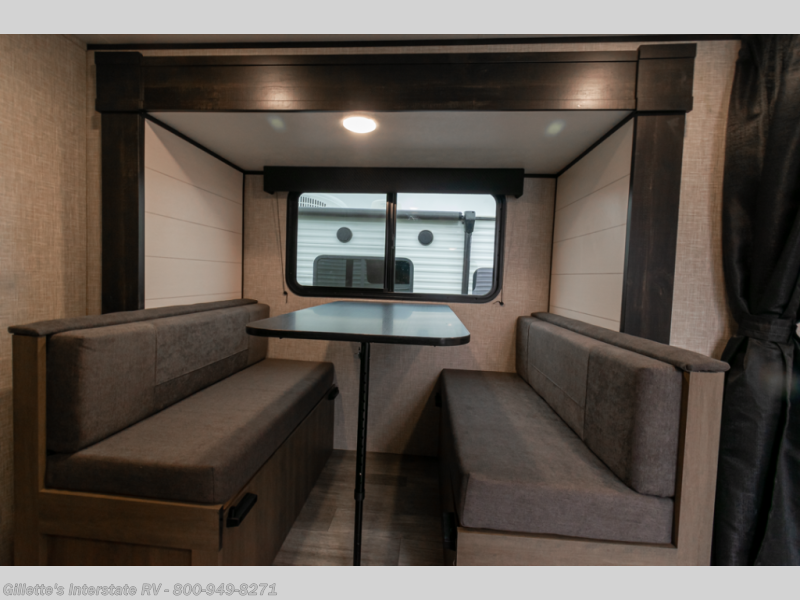 You and your two favorite people can take this Jay Flight SLX travel trailer out for some fun! There is an RV queen bed up at the front, and there are also overhead cabinets and a wardrobe next to the bed for easy storage. The roof-mounted 13.5K BTU air conditioner will keep you cool all day and night. The booth dinette rests on a single slide, so there is more floor space as you work in the kitchen. The rear bathroom gives you space and privacy, and it also offers you a linen closet to store your towels. For other storage needs, you can use the 8-cubic foot refrigerator and the exterior storage compartments.