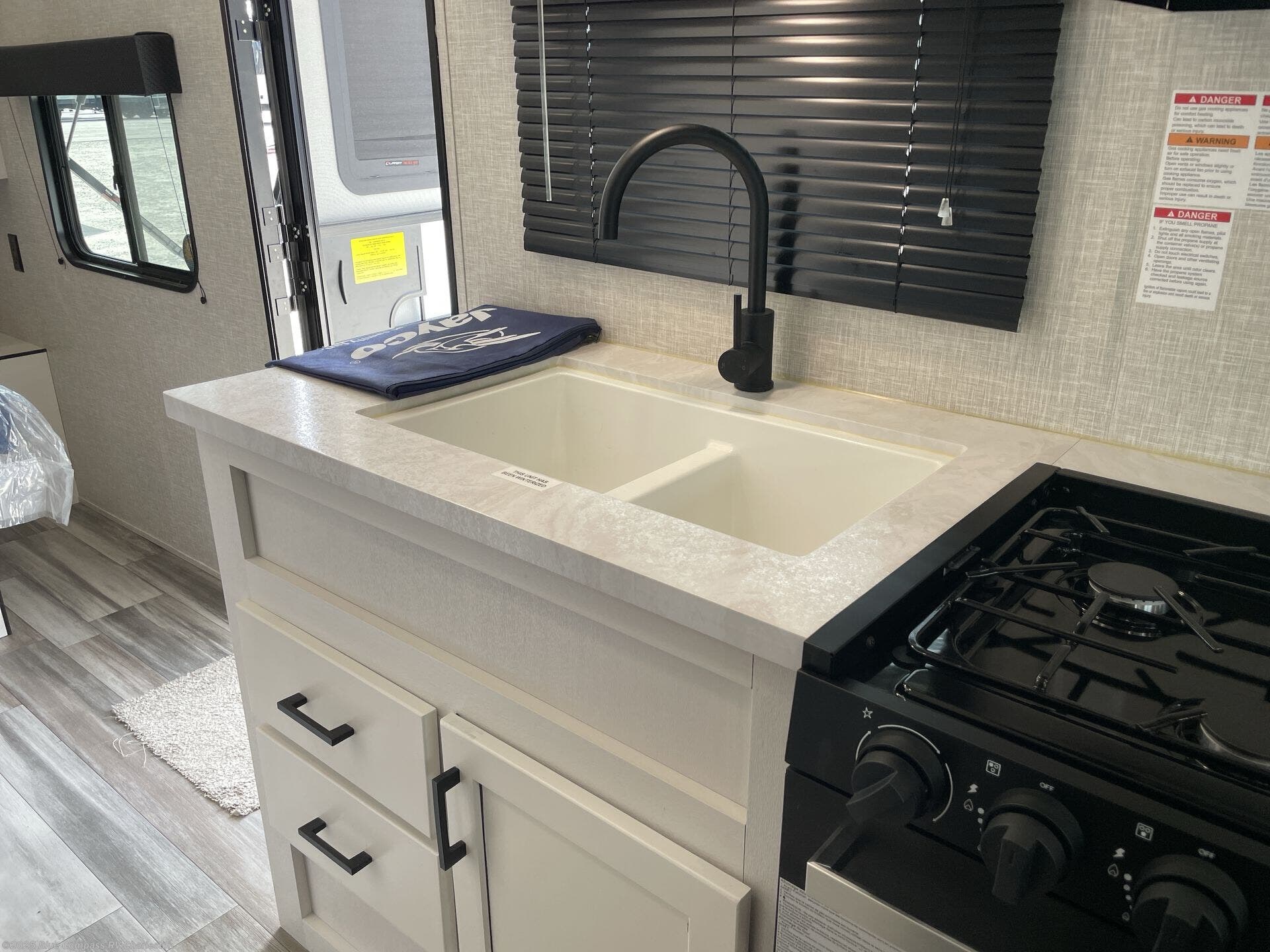 Camping in the woods is just what the doctor ordered and this trailer will provide all the interior comforts you need! There is a three burner cooktop and a microwave oven to prepare meals each day, plus an 8 cu. ft. 12V refrigerator for cold items. After your meal is made, you can dine at the booth dinette or relax on the jack-knife sofa, and these areas can become sleeping space for two to three guests at night. The full bath with a tub/shower means you won't have to use the camp's facilities and the 16' power awning will provide protection from the sun as you visit with other campers!