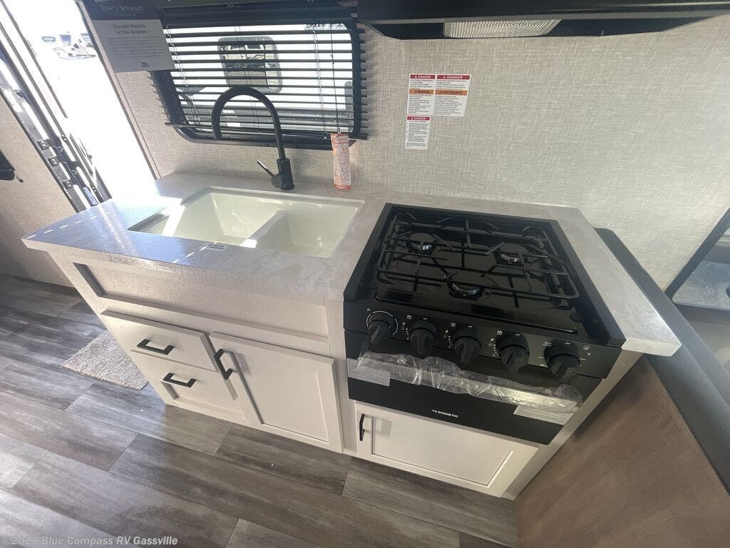 Camping in the woods is just what the doctor ordered and this trailer will provide all the interior comforts you need! There is a three burner cooktop and a microwave oven to prepare meals each day, plus an 8 cu. ft. 12V refrigerator for cold items. After your meal is made, you can dine at the booth dinette or relax on the jack-knife sofa, and these areas can become sleeping space for two to three guests at night. The full bath with a tub/shower means you won't have to use the camp's facilities and the 16' power awning will provide protection from the sun as you visit with other campers!