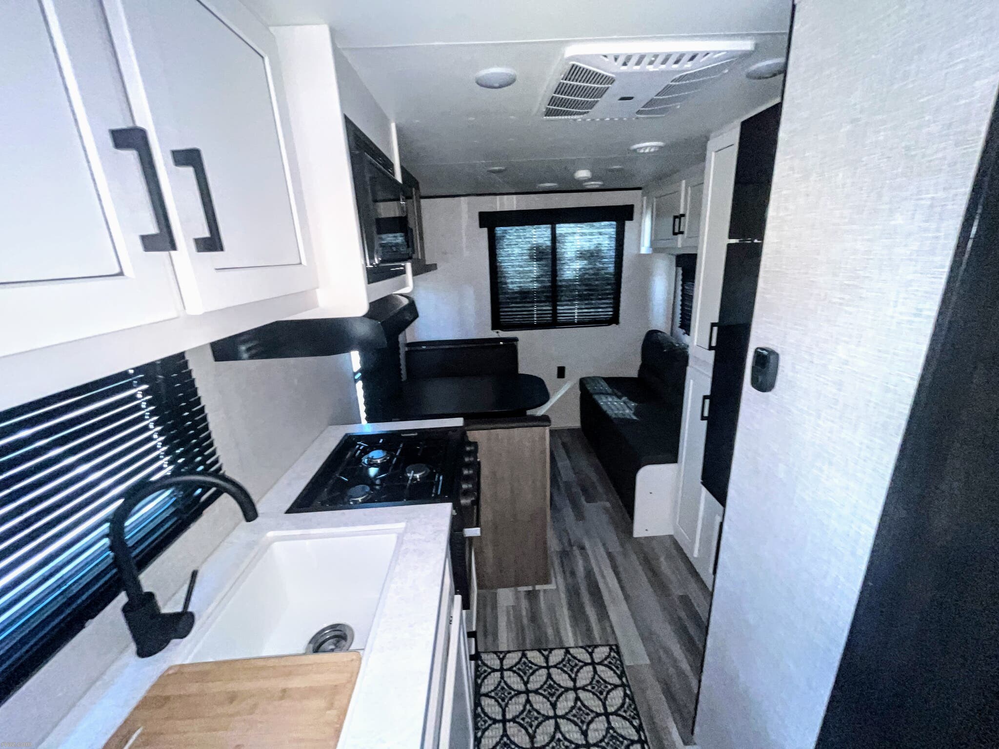 This travel trailer is equipped with a host of essential amenities designed to make every trip enjoyable. Stay comfortable during your travels with a 13,500 BTU air conditioner, while the interior boasts a well-equipped kitchen with a stove top burner, refrigerator, and microwave — perfect for preparing homemade meals on the go. The bathroom features a shower and a toilet, complemented by a medicine cabinet for added storage.