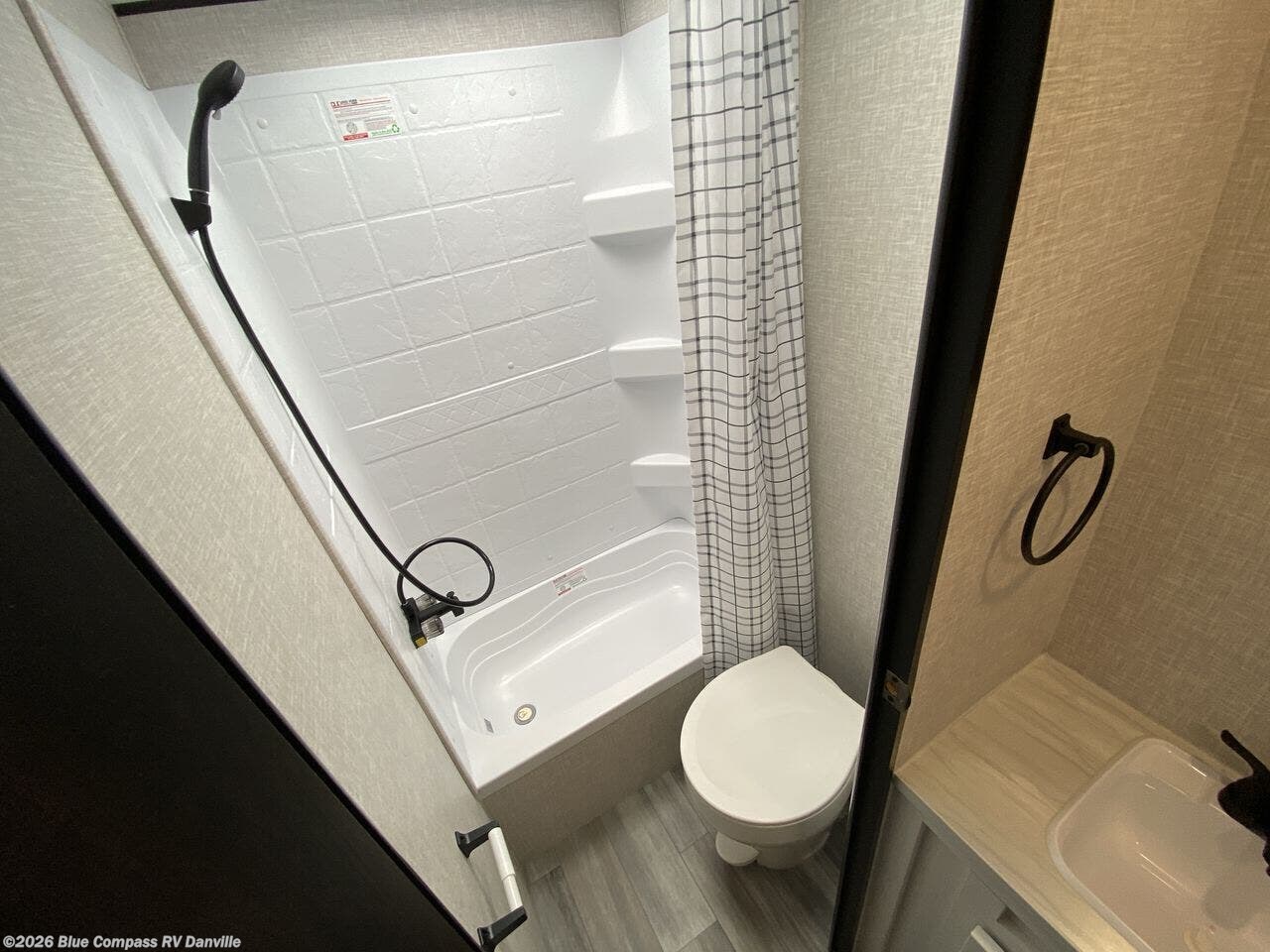 In the rear of the RV on the door side are the (2) double over double bunk beds and beside that, is the bathroom with a toilet, tub/shower combo, a sink with underneath storage and a medicine cabinet. The 260BH is Jayco Jay Flights newest most popular floor plan!