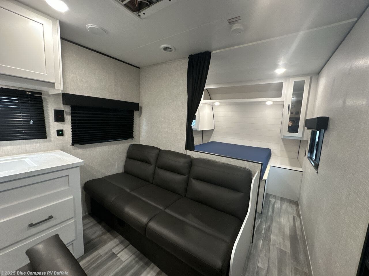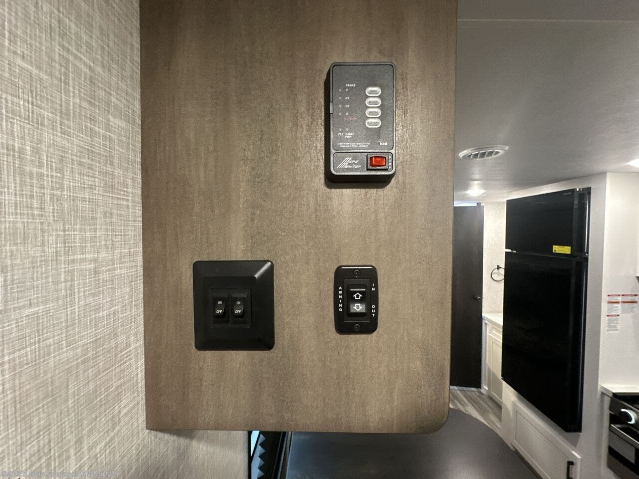 You can comfortably sleep up to 10 people in this trailer thanks to the double-size bunks, the RV queen bed in the front bedroom, plus the booth dinette and jack-knife sofa in the main living area! The chef of your crew will have a three burner cooktop and microwave oven to prepare meals, and everyone can store their favorite drinks in the 8 cu. ft. 12V refrigerator. The bathroom includes a tub/shower and a toilet, with the sink just outside of this room so others can brush their teeth if one is taking a shower before bed. The outside storage will let you bring along fishing poles and the 16' power awning with LED lights will create a nice place to gather in the evenings!