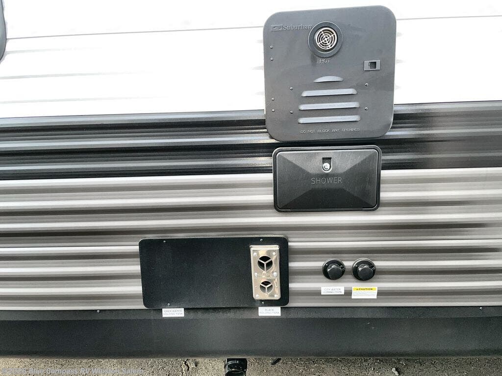 You can comfortably sleep up to six people in this trailer thanks to the RV queen bed in the front bedroom, plus the booth dinette and jack-knife sofa in the main living area! The chef of your crew will have a three burner cooktop and microwave oven to prepare meals, and everyone can store their favorite drinks in the 8 cu. ft. 12V refrigerator. The walk-through bath is spacious and includes a radius shower, toilet, a sink, and linen closet and is the full width of the unit. The outside storage will let you bring along camp chairs and games, fishing poles and more, plus the 18' 3" power awning with LED lights will create a nice place to gather in the evenings!