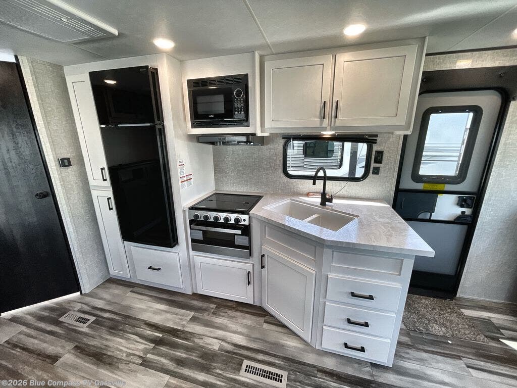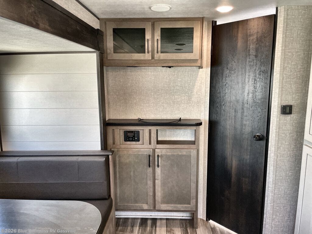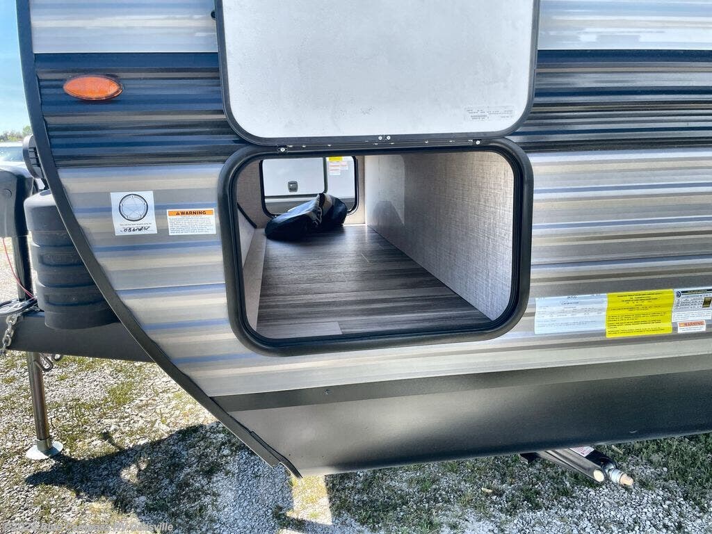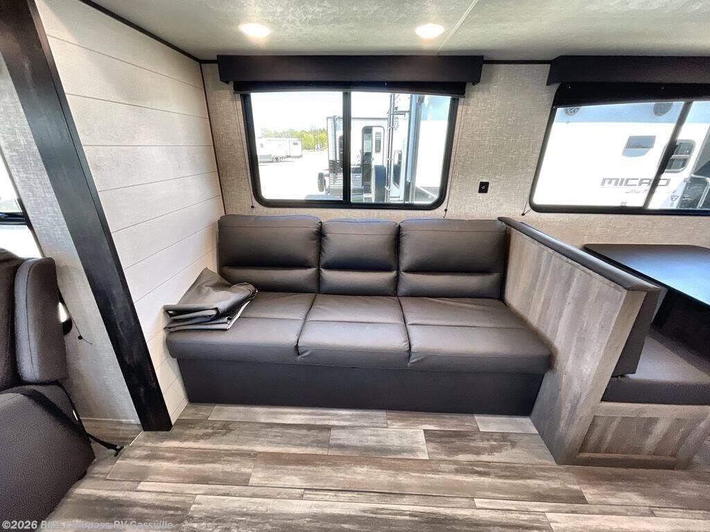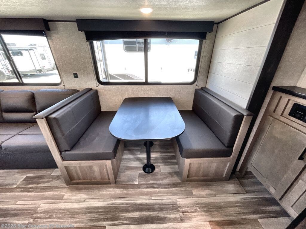 You can comfortably sleep up to six people in this trailer thanks to the RV queen bed in the front bedroom, plus the booth dinette and jack-knife sofa in the main living area! The chef of your crew will have a three burner cooktop and microwave oven to prepare meals, and everyone can store their favorite drinks in the 8 cu. ft. 12V refrigerator. The walk-through bath is spacious and includes a radius shower, toilet, a sink, and linen closet and is the full width of the unit. The outside storage will let you bring along camp chairs and games, fishing poles and more, plus the 18' 3" power awning with LED lights will create a nice place to gather in the evenings!
