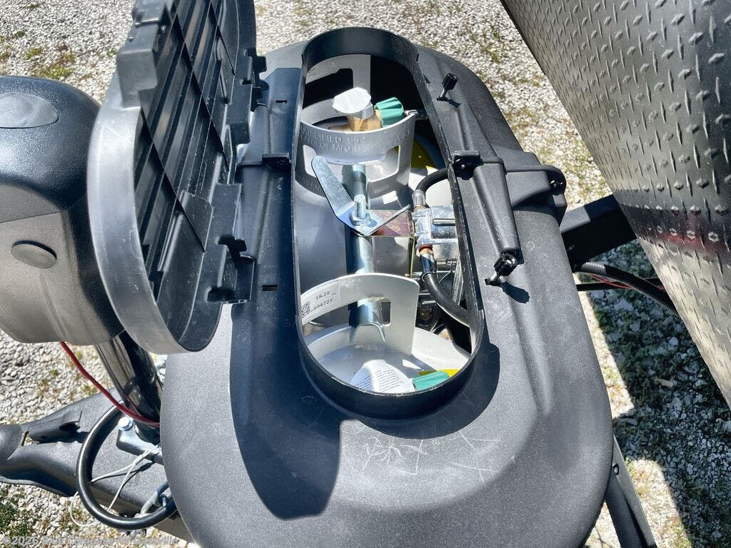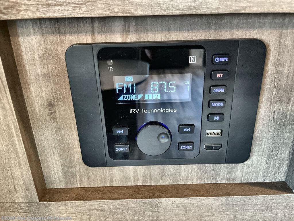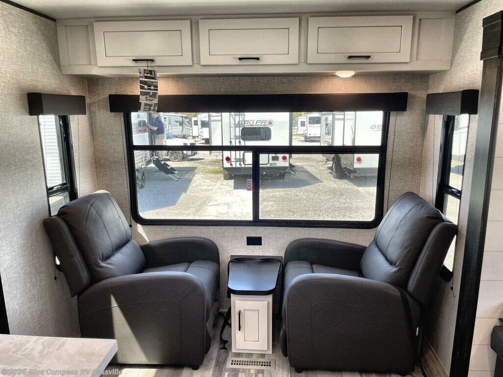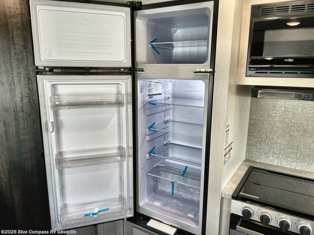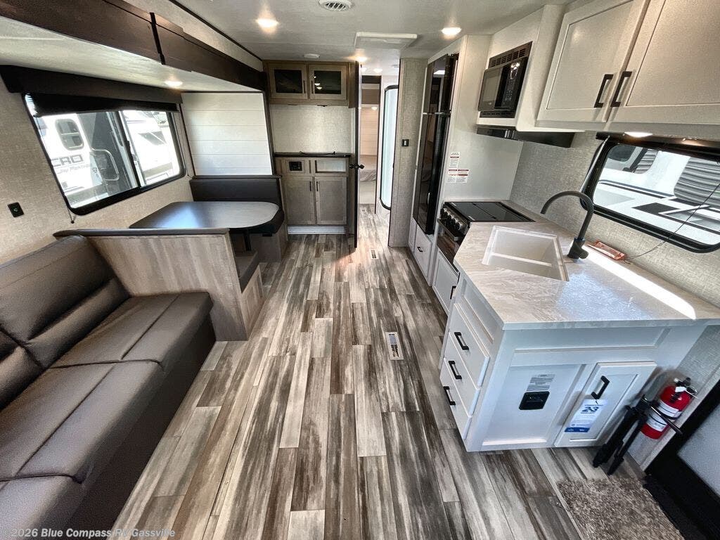 You can comfortably sleep up to six people in this trailer thanks to the RV queen bed in the front bedroom, plus the booth dinette and jack-knife sofa in the main living area! The chef of your crew will have a three burner cooktop and microwave oven to prepare meals, and everyone can store their favorite drinks in the 8 cu. ft. 12V refrigerator. The walk-through bath is spacious and includes a radius shower, toilet, a sink, and linen closet and is the full width of the unit. The outside storage will let you bring along camp chairs and games, fishing poles and more, plus the 18' 3" power awning with LED lights will create a nice place to gather in the evenings!