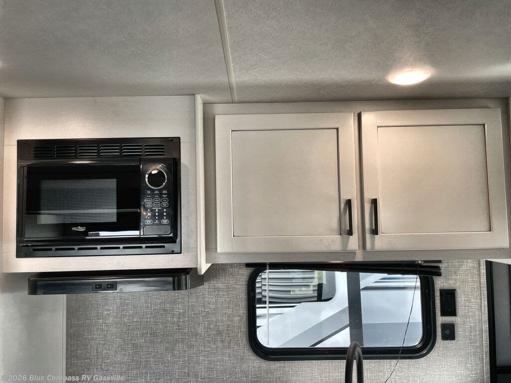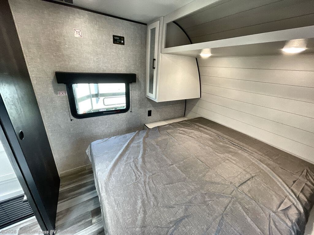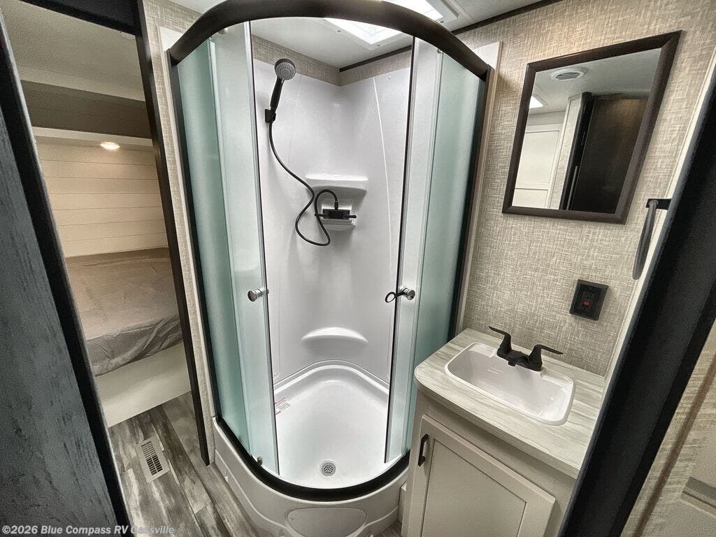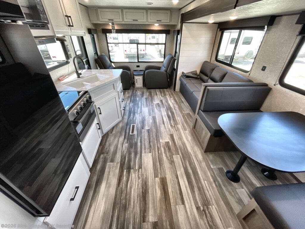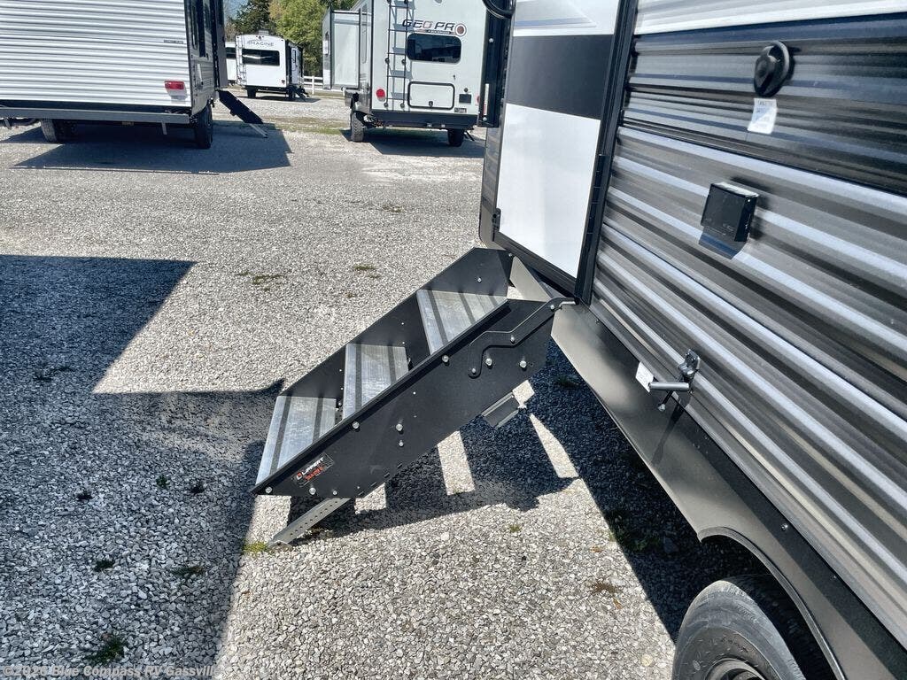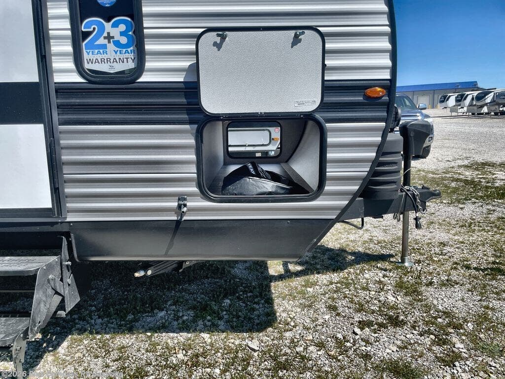 You can comfortably sleep up to six people in this trailer thanks to the RV queen bed in the front bedroom, plus the booth dinette and jack-knife sofa in the main living area! The chef of your crew will have a three burner cooktop and microwave oven to prepare meals, and everyone can store their favorite drinks in the 8 cu. ft. 12V refrigerator. The walk-through bath is spacious and includes a radius shower, toilet, a sink, and linen closet and is the full width of the unit. The outside storage will let you bring along camp chairs and games, fishing poles and more, plus the 18' 3" power awning with LED lights will create a nice place to gather in the evenings!
